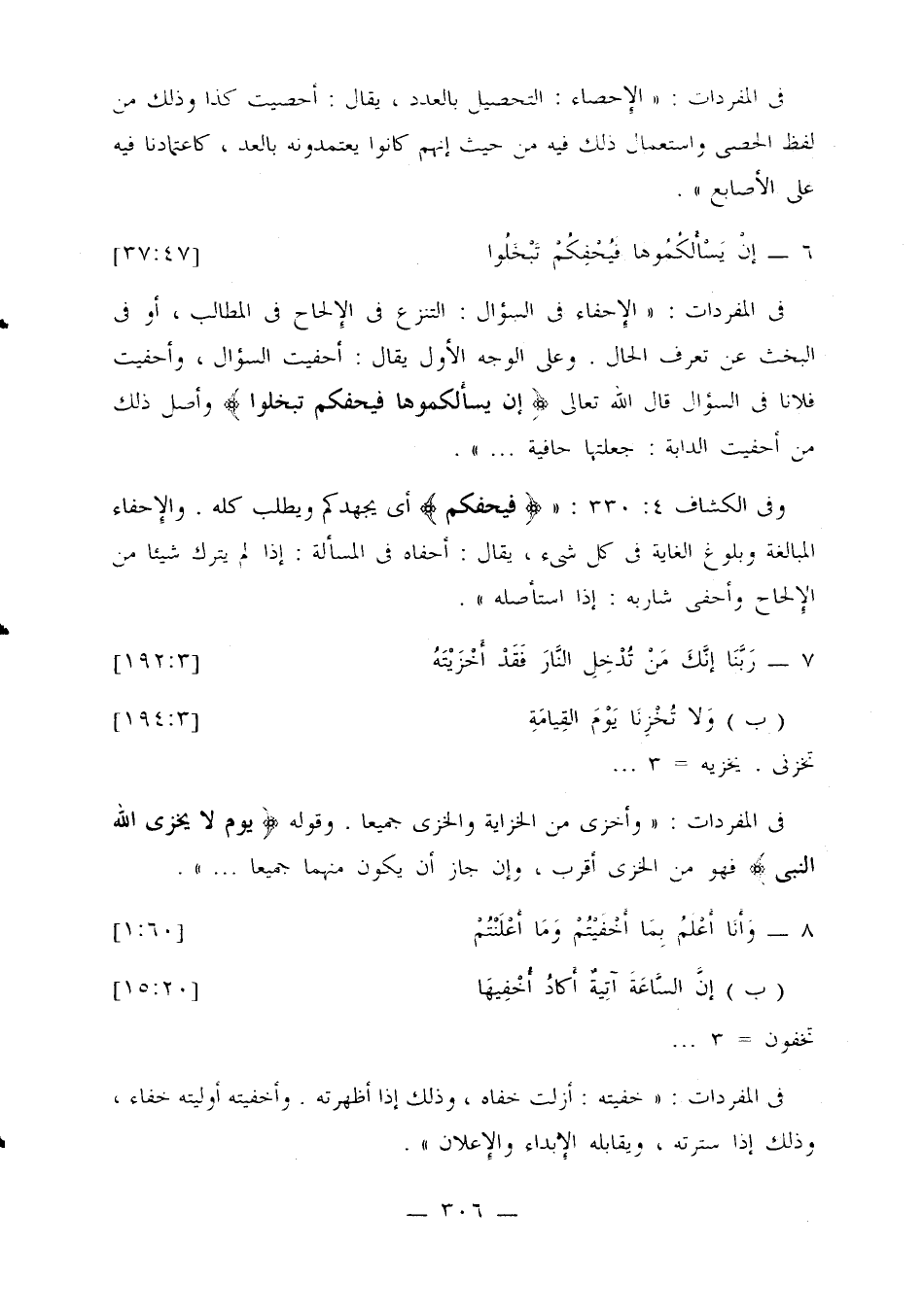 في المفردات: «الإحفاء في السؤال: التنزع في الإلحاح في المطالب، أو في البخث عن تعرف الحال. وعلى الوجه الأولى يقال: أحفيت السؤال، وأحفيت فلانا في السؤال قال الله تعالى: {يسألكموها فيحفكم تبخلوا} وأصل ذلك من أحفيت الدابة: جعلتها حافية ...».
