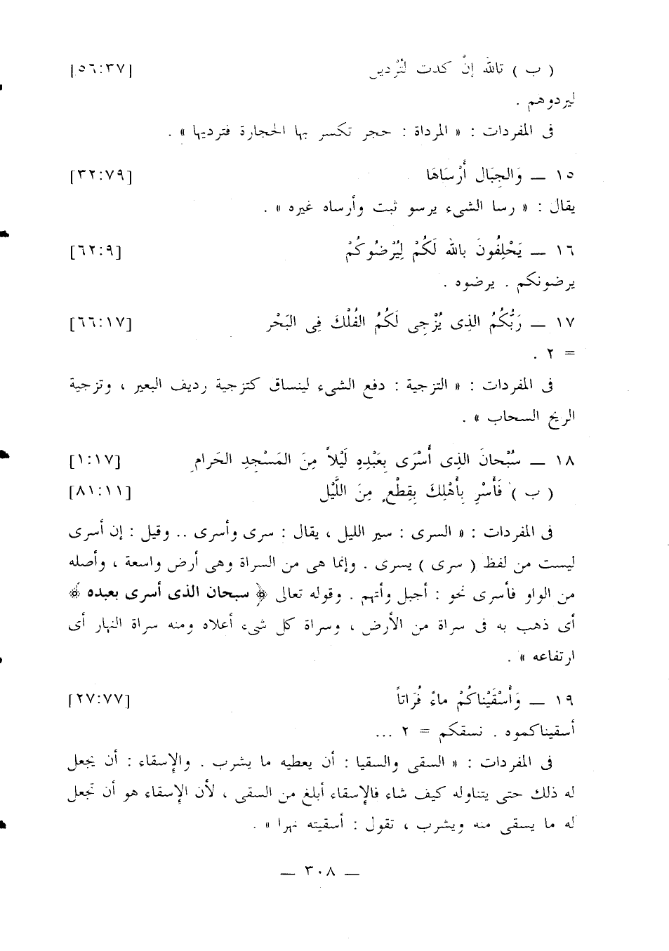 في المفردات: «السرى: سير الليل، يقال: سرى وأسرى ... وقيل: إن أسرى ليست من لفظ (سرى) يسرى. وإنما هي من السراة وهي أرض واسعة، وأصله من الواو فأسرى نحو: أجبل وأتهم. وقوله تعالى {سبحان الذي أسرى بعبده} أي ذهب به في سراة من الأرض، وسراة كل شيء أعلاه ومنه سراة النهار أي ارتفاعه».