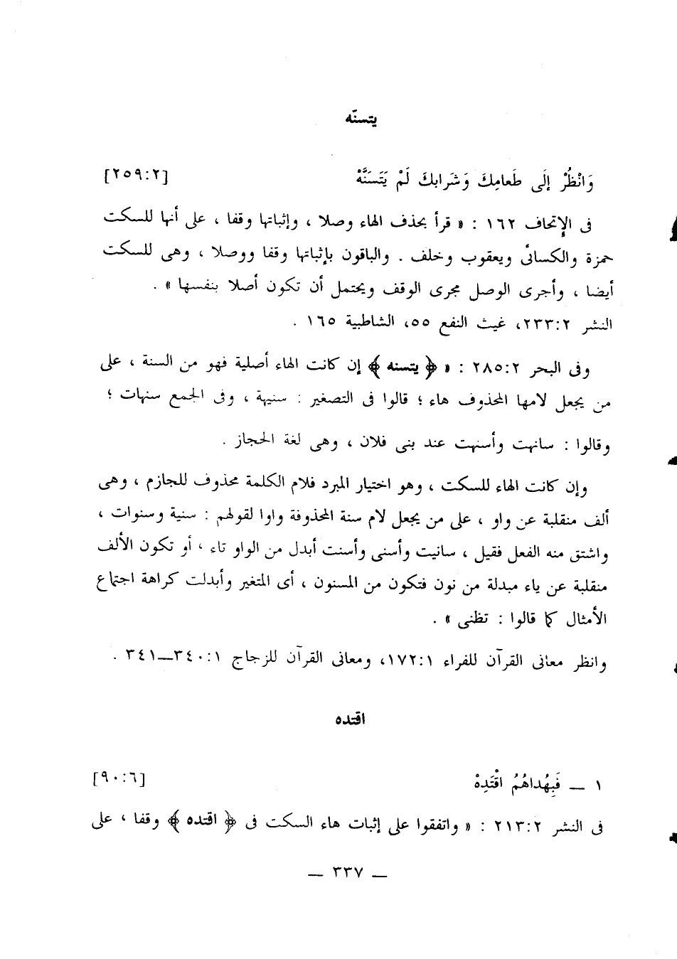 وفي البحر 2: 285: «{يتسنه} إن كانت الهاء أصلية فهو من السنة، على من يجعل لامها المحذوف هاء؛ قالوا في التصغير: سنيهة، وفي الجمع سنهات؛ وقالوا: سانهت وأسنهت عند بني فلان، وهي لغة الحجاز.