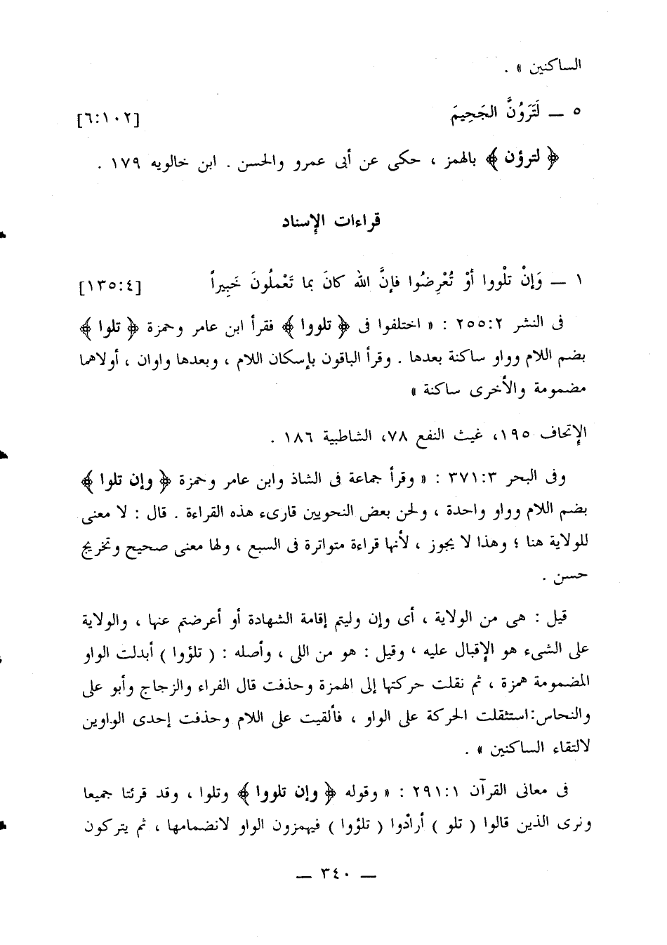 وفي البحر 3: 371: «وقرأ جماعة في الشاذ وابن عامر وحمزة {وإن تلوا} بضم اللام وواو واحدة، ولحن بعض النحويين قارئ هذه القراءة. قال: لا معنى للولاية هنا؛ وهذا لا يجوز، لأنها قراءة متواترة في السبع، ولها معنى صحيح وتخريج حن.