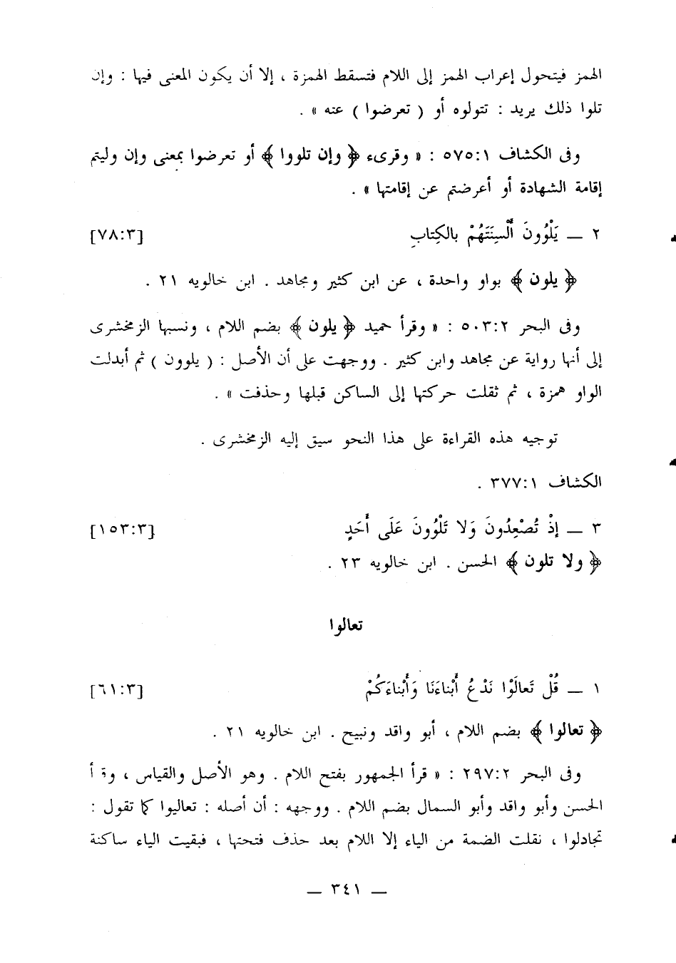 وفي البحر 2: 503: «وقرأ حميد {يلون} بضم اللام، ونسبها الزمخشري إلى أنها رواية عن مجاهد وابن كثير. ووجهت على أن الأصل: (يلوون) ثم أبدلت الواو همزة، ثم ثقلت حركتها إلى الساكن قبلها وحذفت».