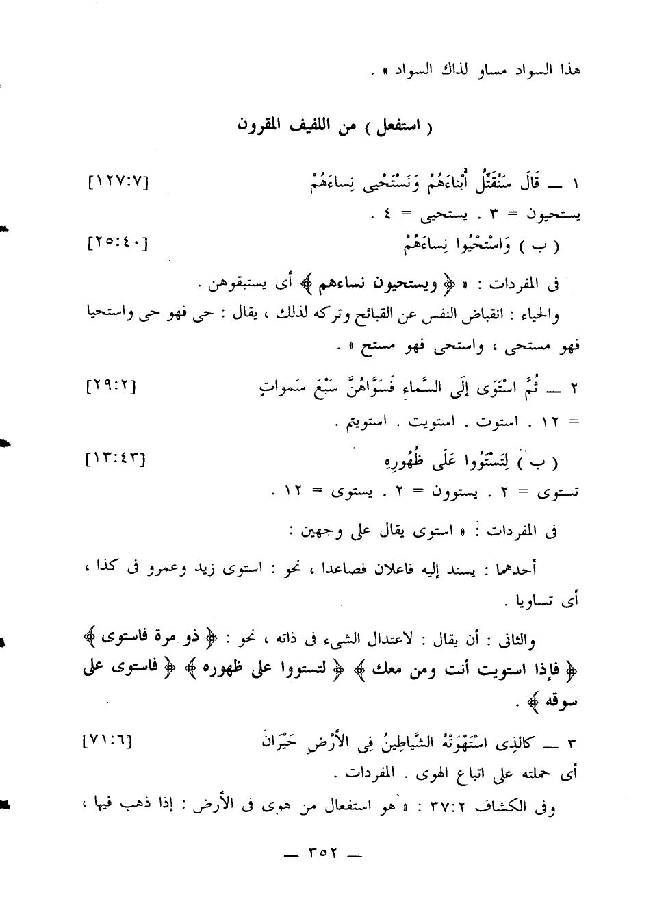 والثاني: أن يقال: لاعتدال الشيء في ذاته، نحو: {ذو مرة فاستوى} {فإذا استويت أنت ومن معك} {لتستووا على ظهوره} {فاستوى على سوقه}».