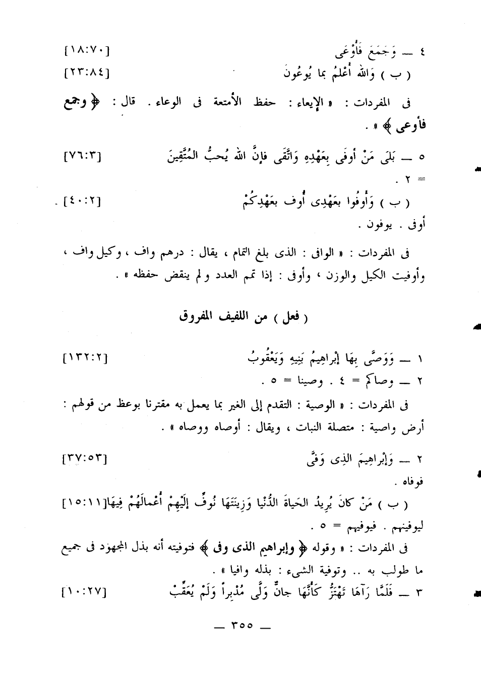 في المفردات: «الوافي: الذي بلغ التمام، يقال: درهم واف، وكيل واف، وأوفيت الكيل والوزن، وأوفى: إذا تمم العدد ولم ينقص حفظه».