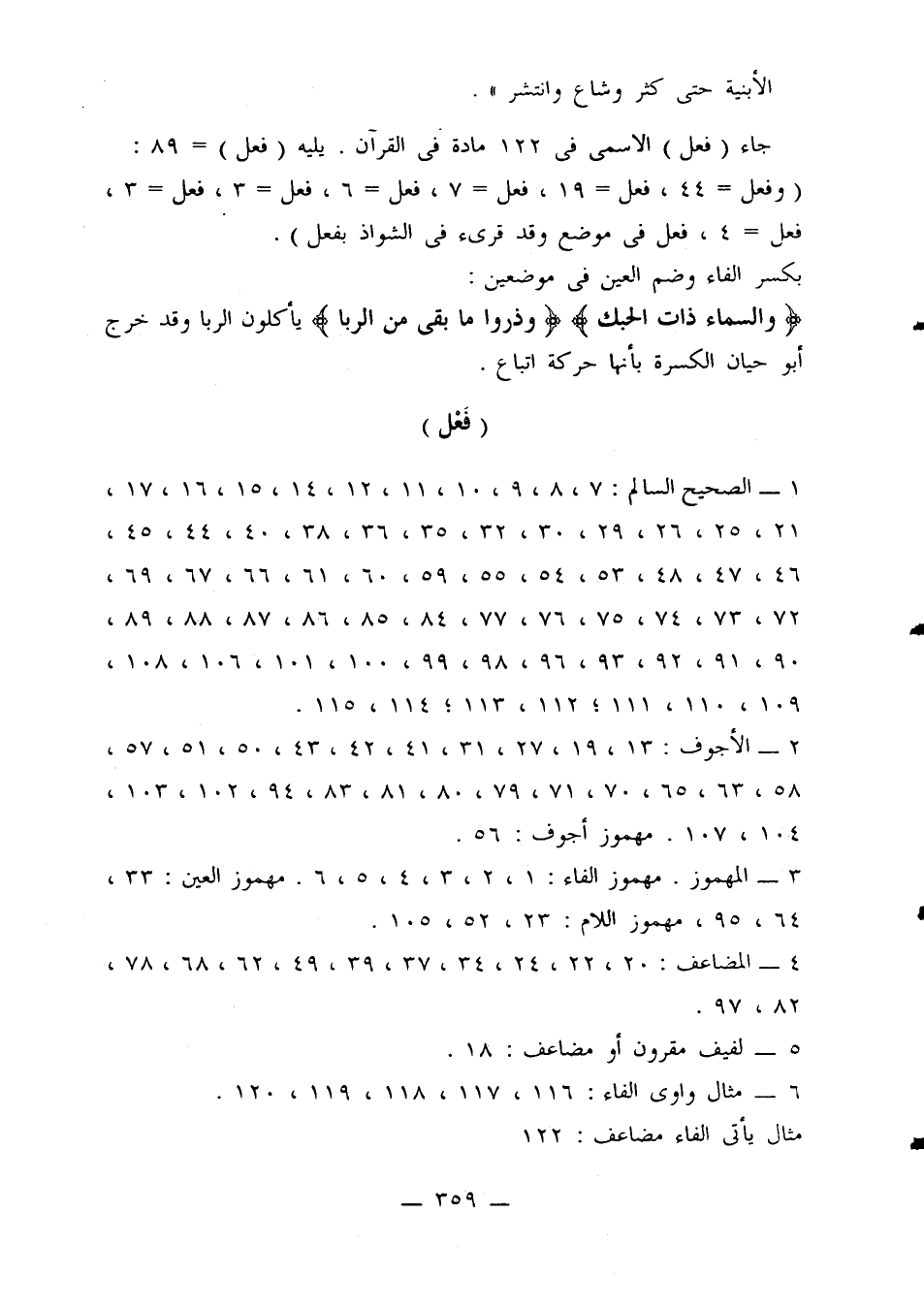 2 - الأجوف: 13، 19، 27، 31، 41، 42، 43، 50، 51، 57، 58، 63، 65، 70، 71، 79، 80، 81، 83، 94، 102، 103، 104، 107. مهموز أجوف: 56.