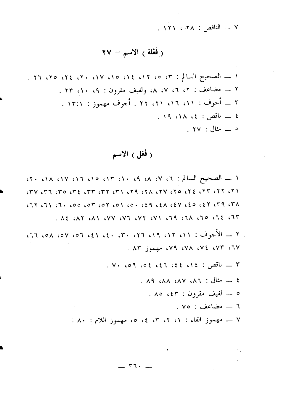 2 - الأجوف: 11، 12، 19، 26، 30، 40، 41، 56، 57، 58، 66، 67، 73، 74، 78، 79، مهموز 83.