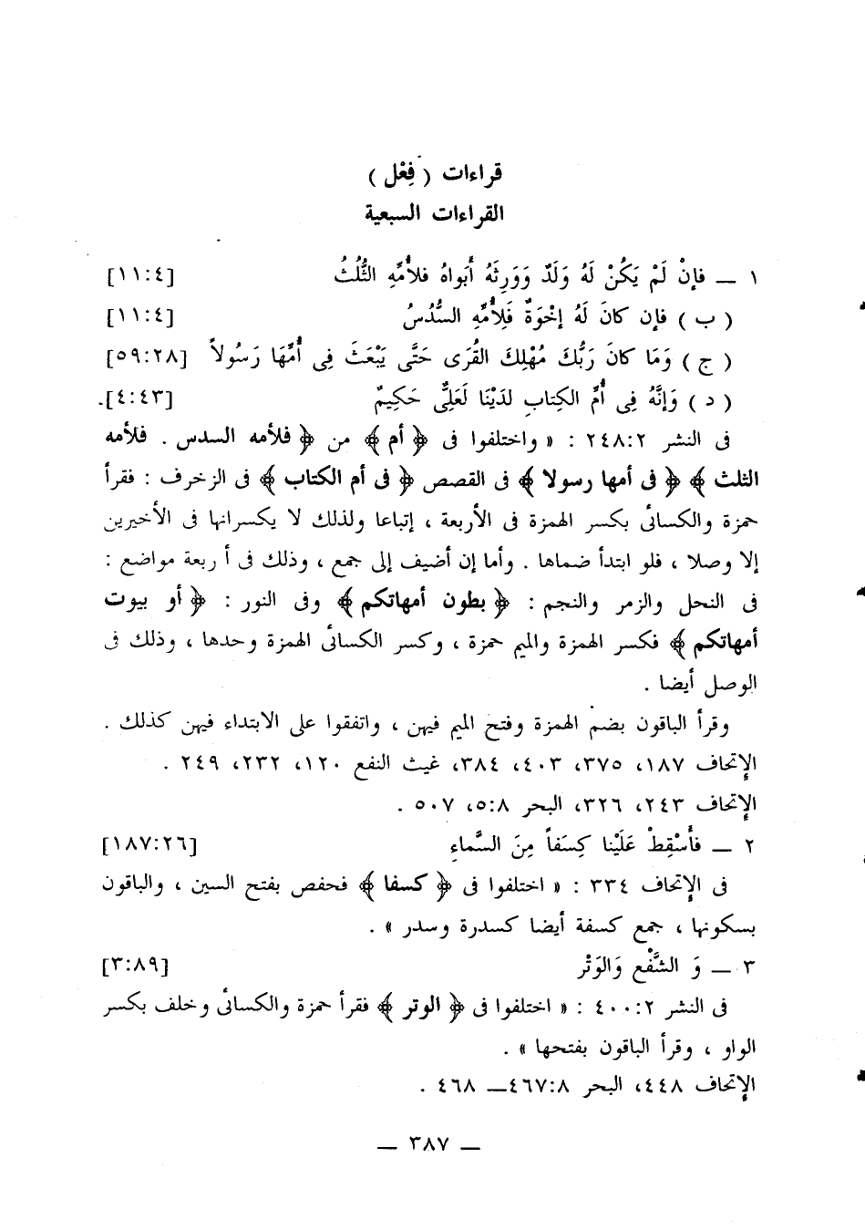 في النشر 2: 248: «واختلفوا في {أم} من {فلأمه السدس فلأمه الثلث} {في أمها رسولا} في القصص {في أم الكتاب} في الزخرف. فقرأ حمزة والكسائي بكسر الهمزة في الأربعة، إتباعا ولذلك لا يكسرانها في الأخيرين إلا وصلا، فلو ابتدأ ضماها. وأما إن أضيف إلى جمع، وذلك في أربعة مواضع: في النحل والزمر والنجم: {بطون أمهاتكم} وفي النور: {أو بيوت أمهاتكم} فكسر الهمزة والميم حمزة، وكسر الكسائي الهمزة وحدها، وذلك في الوصل أيضًا.
