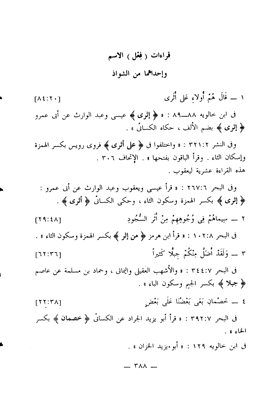 وفي البحر 6: 267: «قرأ عيسى ويعقوب وعبد الوارث عن أبي عمرو: {إثري} بكسر الهمزة وسكون الثاء، وحكى الكسائي {أثري}».