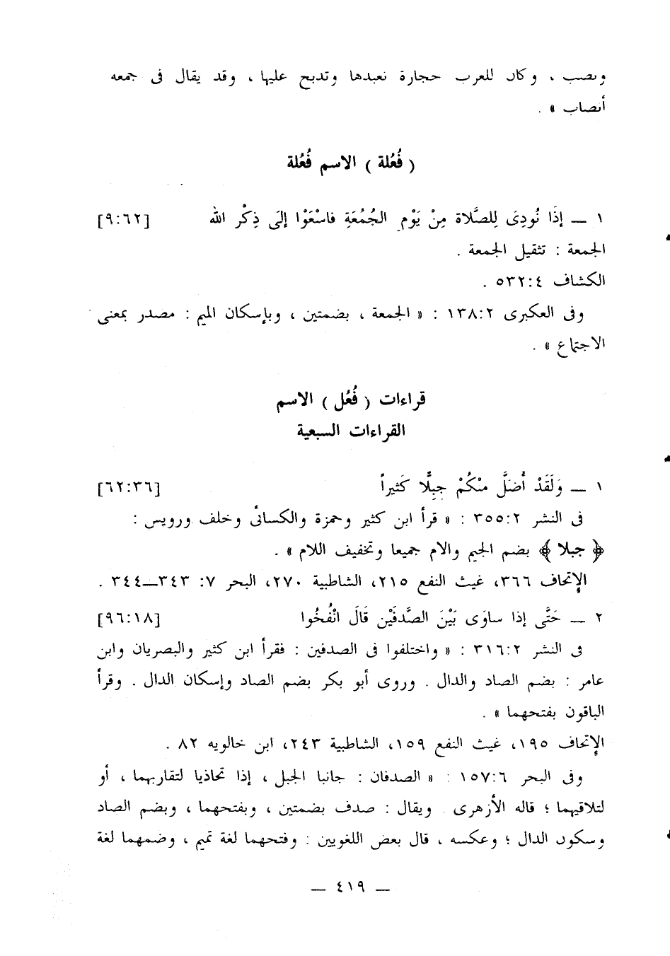 في النشر 2: 355: «قرأ ابن كثير وحمزة والكسائي وخلف ورويس: {جبلا} بضم الجيم والام جميعا وتخفيف اللام».