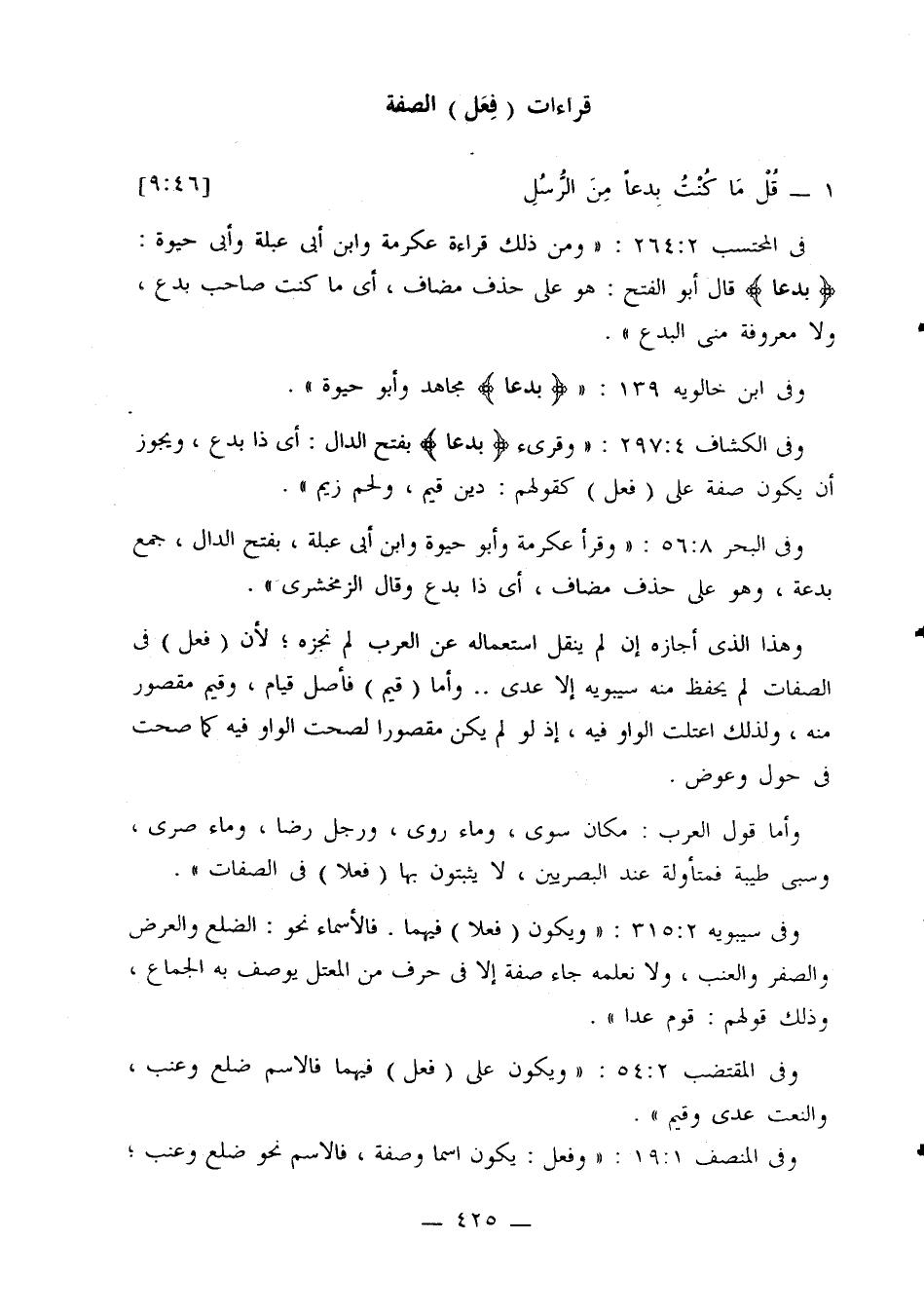 في المحتسب 2: 264: «ومن ذلك قراءة عكرمة وابن أبي عبلة وأبي حيوة: {بدعا} قال أبو الفتح: هو على حذف مضاف، أي ما كنت صاحب بدع، ولا معروفة مني البدع».
