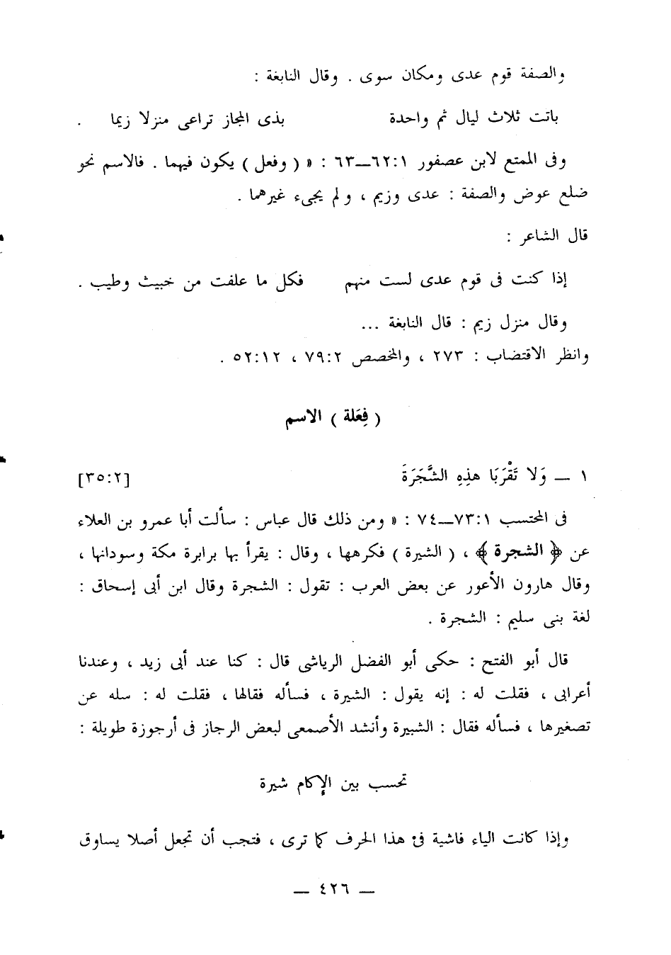 في المحتسب 1: 73 - 74: «ومن ذلك قال عباس: سألت أبا عمرو بن العلاء عن {الشجرة}، (الشيرة) فكرهها، وقال: يقرأ بها برابرة مكة وسودانها، وقال هارون الأعور عن بعض العرب: تقول: الشجرة وقال ابن أبي إسحاق: لغة بني سليم: الشجرة.