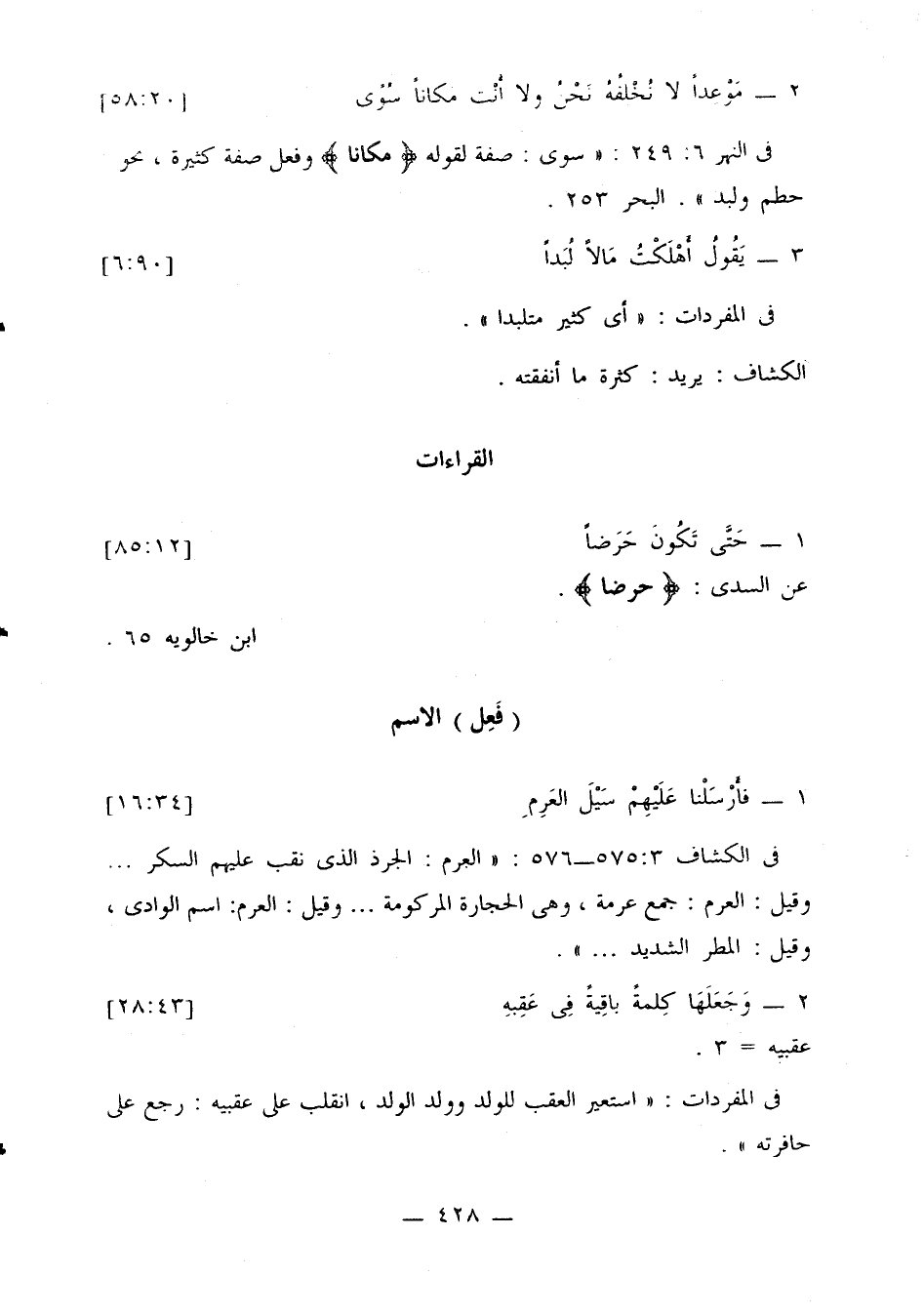 في الكشاف 3: 575 - 576: «العرم: الجرذ الذي نقب عليهم السكر ... وقيل: العرم: جمع عرمة، وهي الحجارة المركومة ... وقيل: العرم: اسم الوادي، وقيل: المطر الشديد ...».