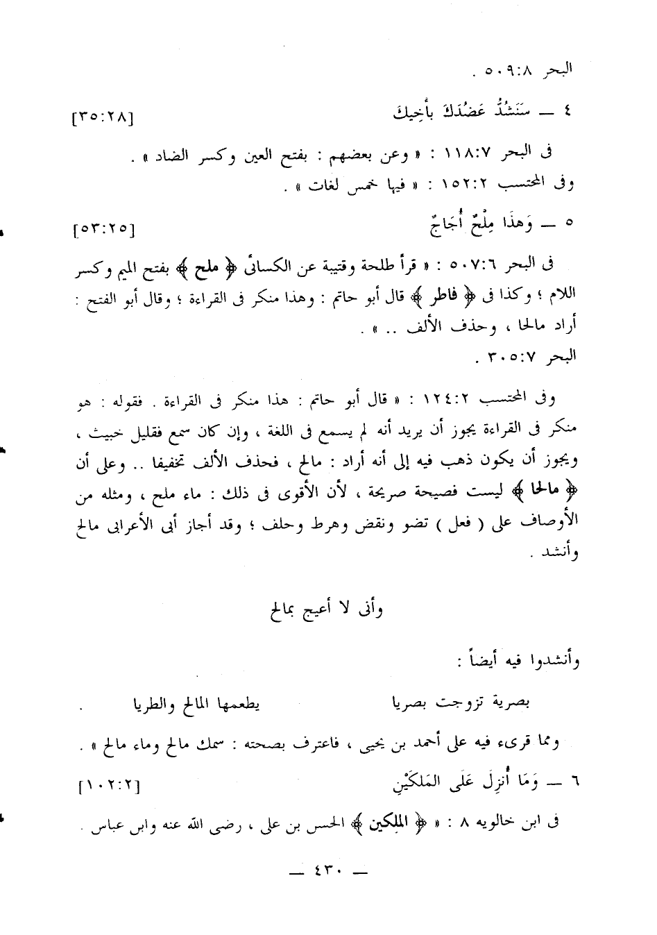 في البحر 6: 507: «قرأ طلحة وقتيبة عن الكسائي {ملح} بفتح الميم وكسر اللام، وكذا في {فاط. ر} قال أبو حاتم: وهذا منكر في القراءة؛ وقال أبو الفتح: أراد مالحا، وحذف الألف ...».