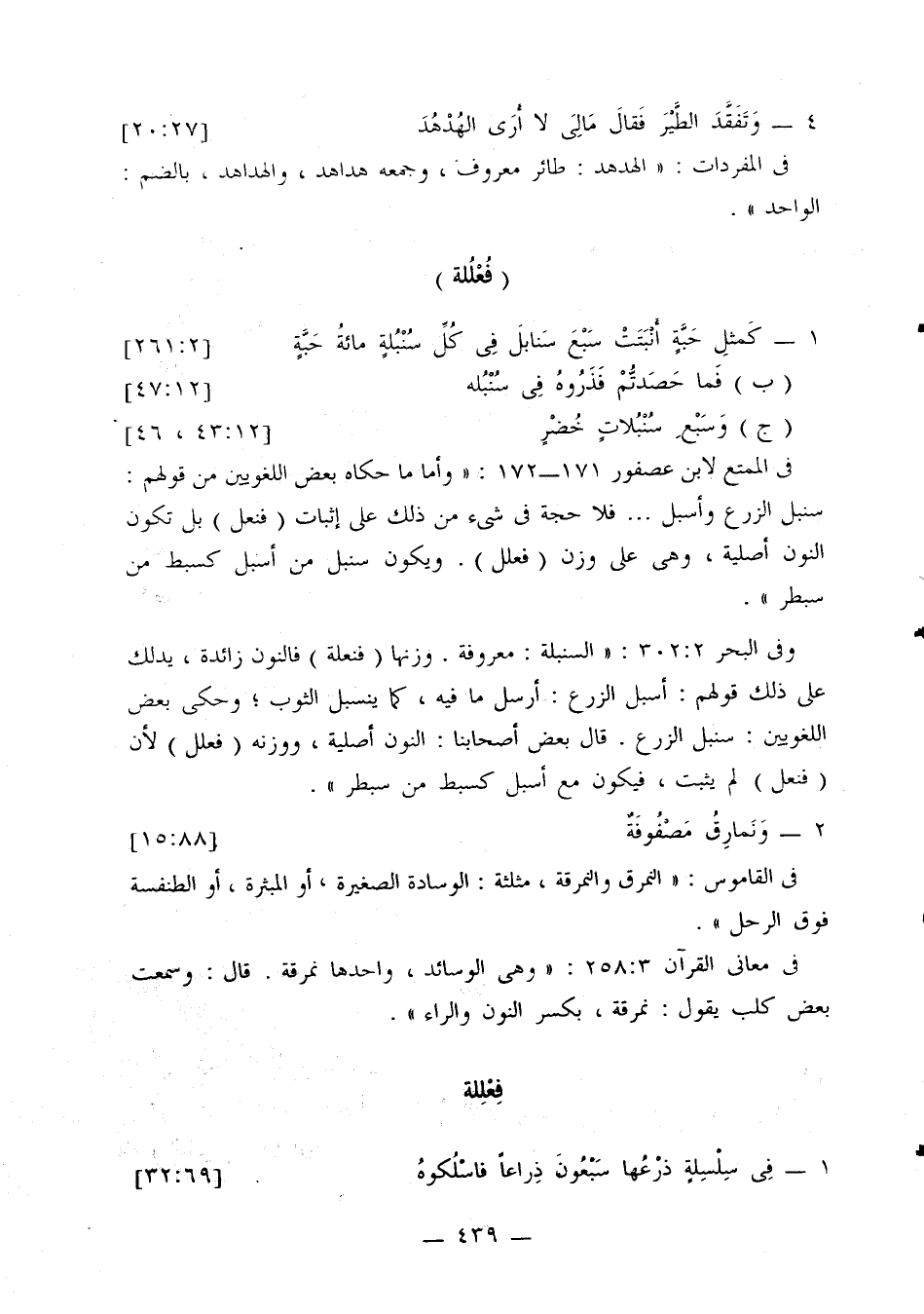 في الممتع لابن عصفور 171 - 172: «وأما ما حكاه بعض اللغوين من قولهم: سنبل الزرع وأسبل ... فلا حجة في شيء من ذلك على إثبات (فنعل) بل تكون النون أصلية، وهي على وزن (فعلل). ويكون سنبل من أسبل كسبط من سبطر».