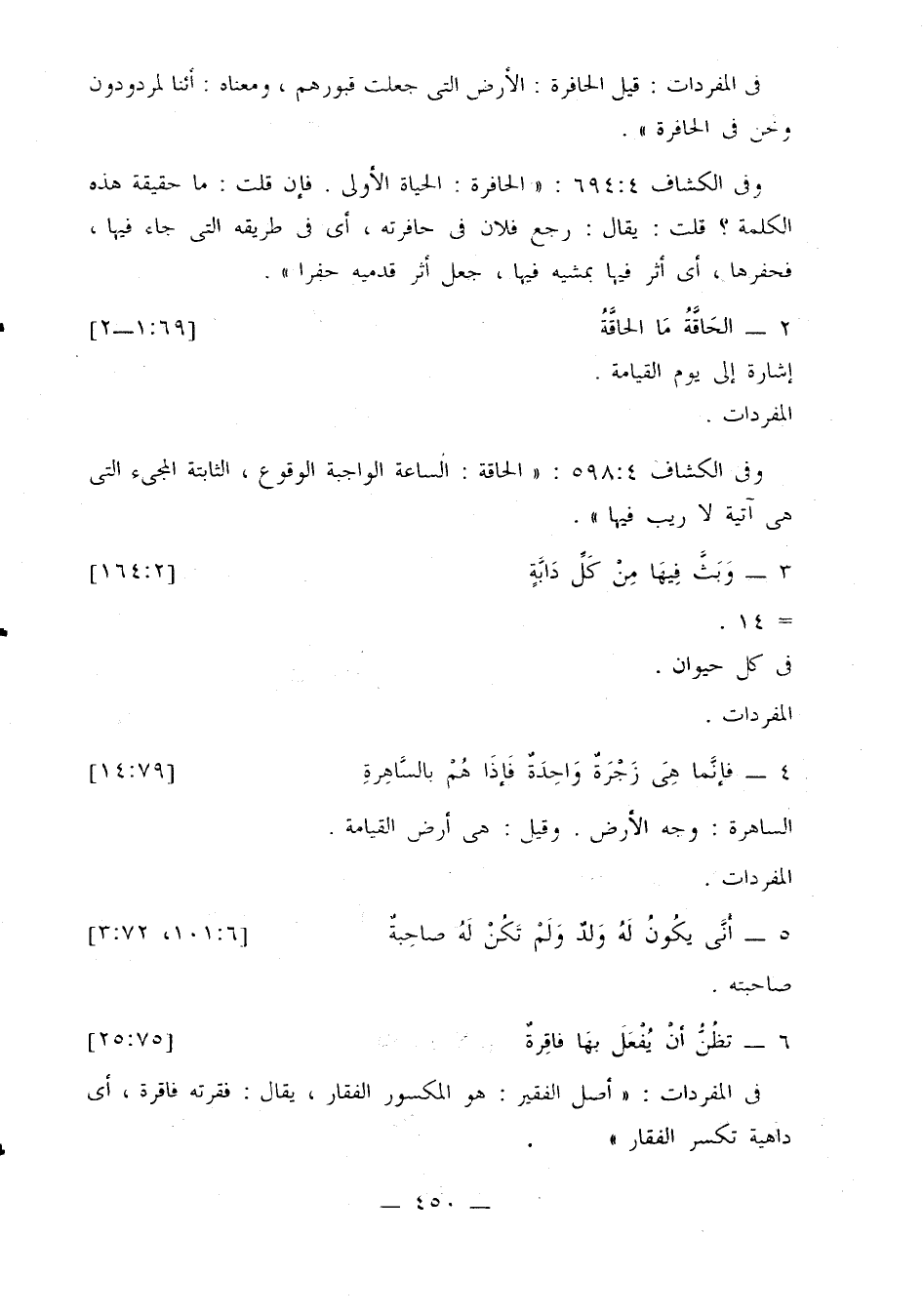 وفي الكشاف 4: 694: «الحافرة: الحياة الأولى. فإن قلت: ما حقيقة هذه الكلمة؟ قلت: يقال: رجع فلان في حافرته، أي في طريقه التي جاء فيها، فحفرها، أي أثر فيها بمشيه فيها، جعل أثر قدميه حفرا».