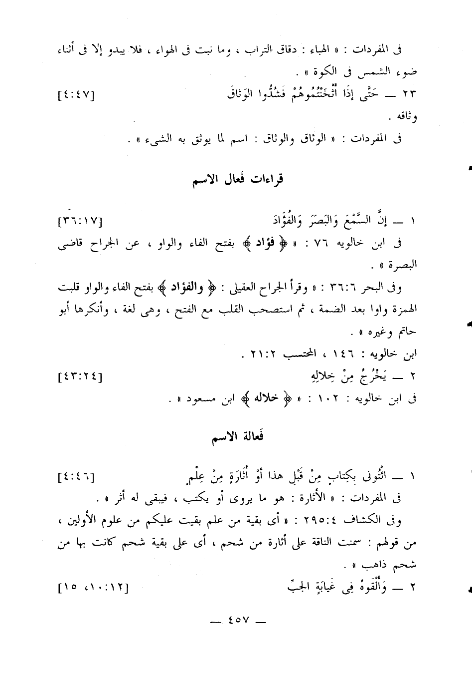 وفي البحر 6: 36: «وقرأ الجراح العقيل: {والفؤاد} بفتح الفاء والواو قلبت الهمزة واوا بعد الضمة، ثم استصحب القلب مع الفتح، وهي لغة، وأنكرها أبو حاتم وغيره».