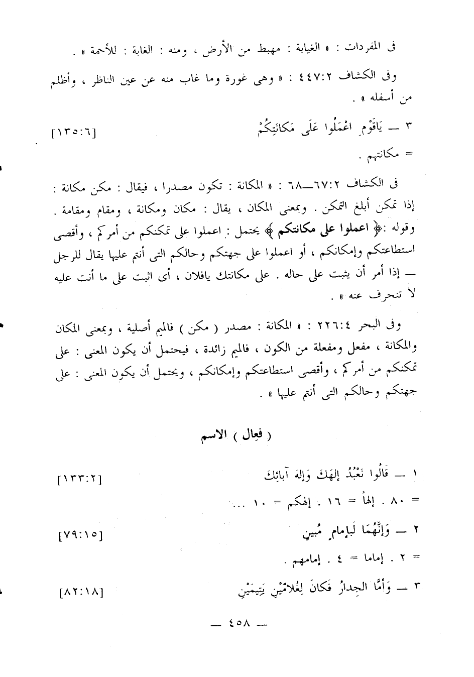 في الكشاف 2: 67 - 68: «المكانة: تكون مصدرا، فيقال: مكن مكانة: إذا تمكن أبلغ التمكن. وبمعنى المكان، يقال: مكان ومكانة، ومقام ومقامة. وقوله: {اعملوا على مكانتكم} يحتمل: اعملوا على تمكنكم من أمركم، وأقصى استطاعتكم وإمكانكم، أو اعملوا على جهتكم وحالكم التي أنتم عليها يقال للرجل - إذا أمر أن يثبت على حاله. على مكانتك يا فلان، أي اثبت على ما أنت عليه لا تنحرف عنه».