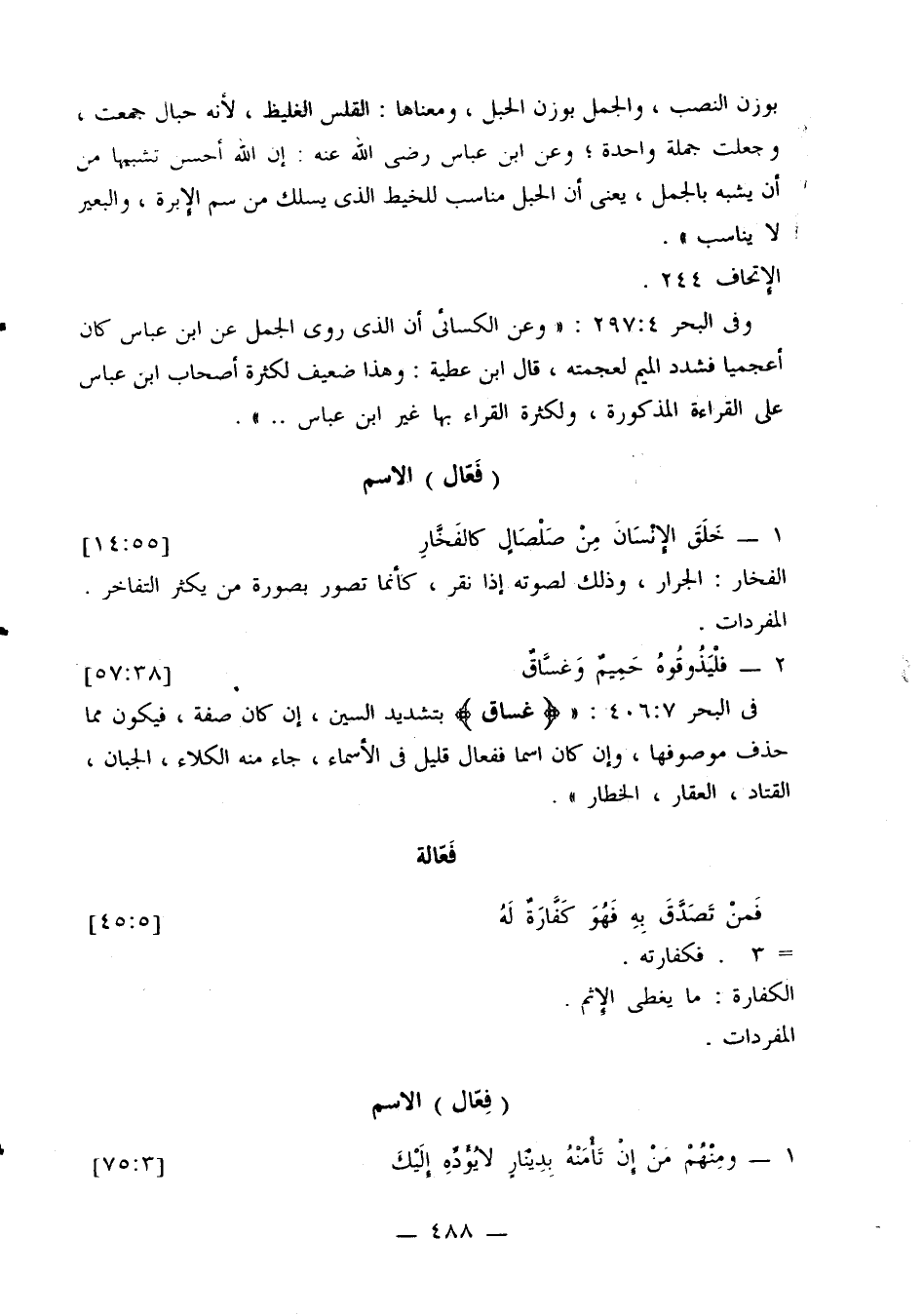في البحر 7: 406: «{غساق} بتشديد السين، إن كان صفة، فيكون مما حذف موصوفها، وإن كان اسما ففعال قليل في الأسماء، جاء منه الكلاء، الجبان، القتاد، العقار، الخطار».