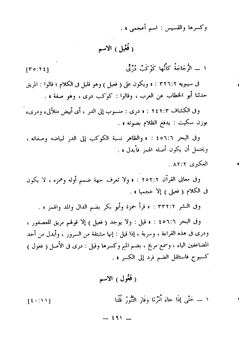 وفي البحر 6: 456: «قيل: ولا يوجد (فعيل) إلا قولهم مريق للعصفور، ودرى في هذه القراءة، وسرية، إذا قيل: إنها مشتقة من السرور، وأبدل من أحد المضاعفين الياء، وسمع مريخ، بضم الميم وكسرها وقيل: درى في الأصل (فعول) كسبوح فاستثقل الضم فرد إلى الكسر».