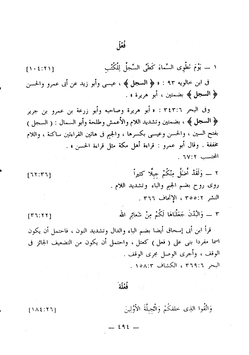 وفي البحر 6: 343: «أبو هريرة وصاحبه وأبو زرعة بن عمرو بن جرير {السجل}، بضمتين وتشديد اللام والأعمش وطلحة وأبو السمال: (السجل) بفتح السين، والحسن وعيسى بكسرها، والجيم في هاتين القراءتين ساكنة، واللام مخففة. وقال أبو عمرو: قراءة أهل مكة مثل قراءة الحسن».