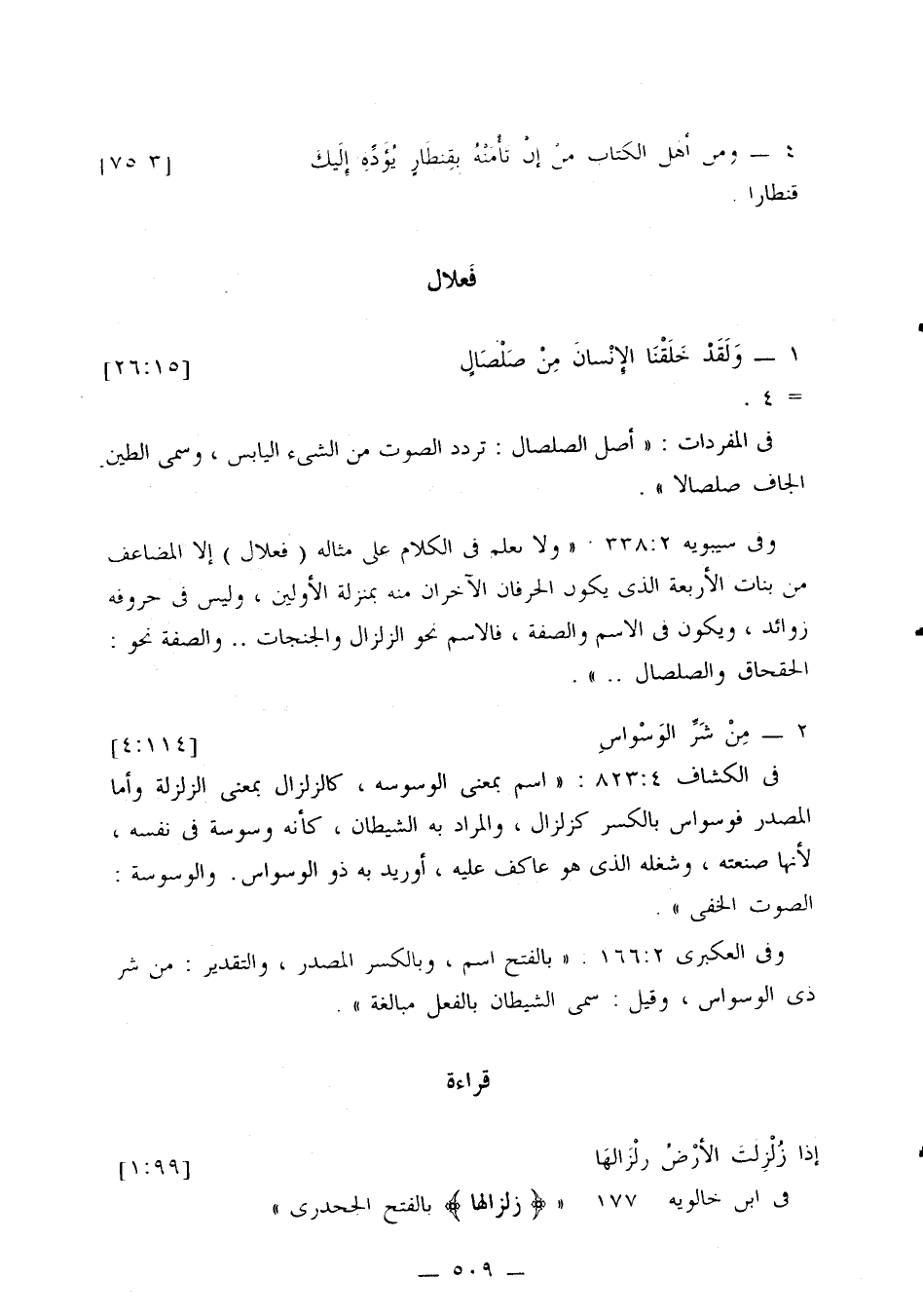 وفي سيبويه 2: 338: «ولا نعلم في الكلام على مثاله (فعلال) إلا المضاعف من بنات الأربعة الذي يكون الحرفان الآخران منه بمنزلة الأولين، وليس في حروفه زوائد، ويكون في الاسم والصفة، فالاسم نحو الزلزال والجنجات ... والصفة نحو: الحقحاق والصلصال ...».