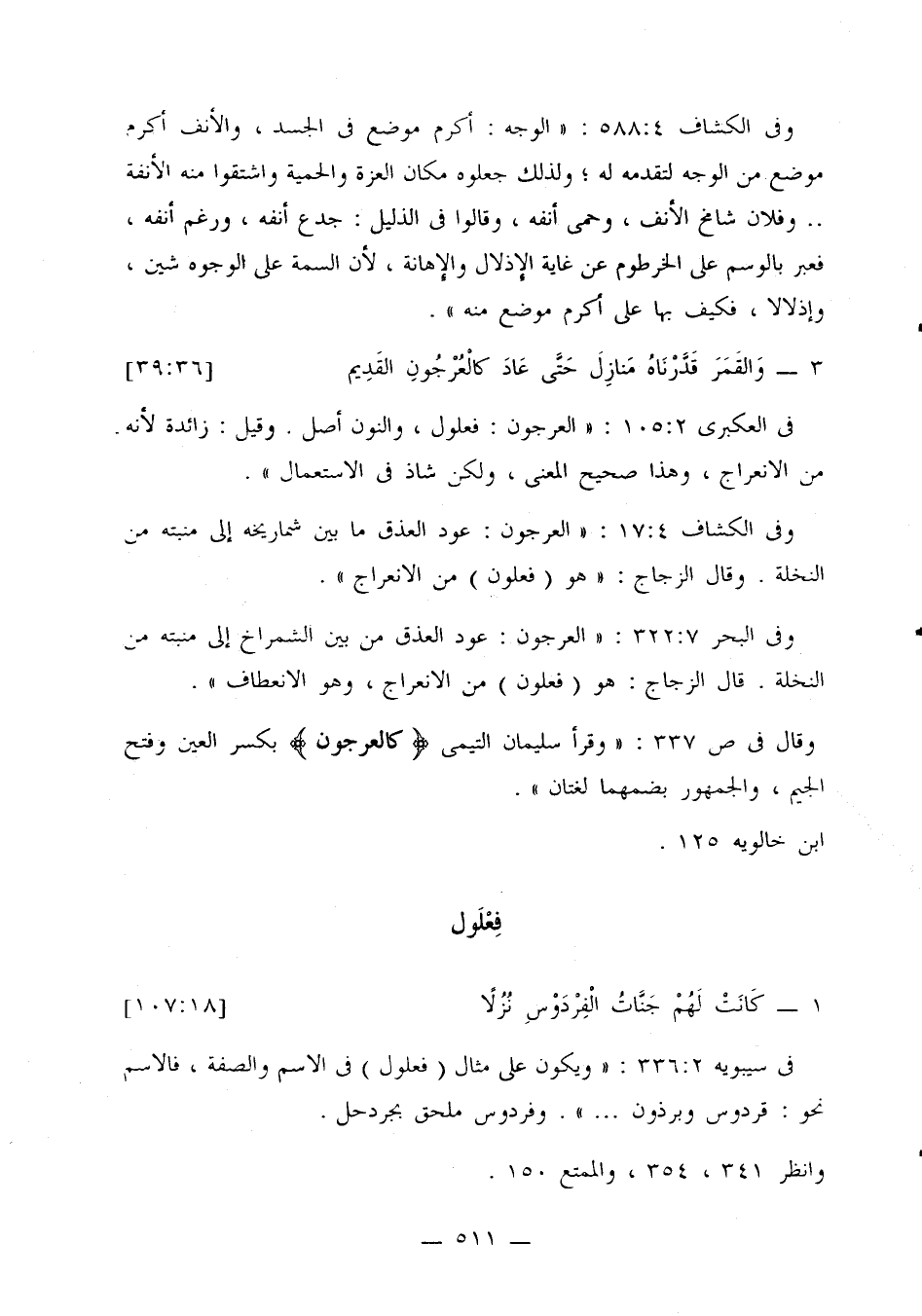 في العكبري 2: 105: «العرجون: فعلول، والنون أصل. وقيل: زائدة لأنه. من الانعراج، وهذا صحيح المعنى، ولكن شاذ في الاستعمال».