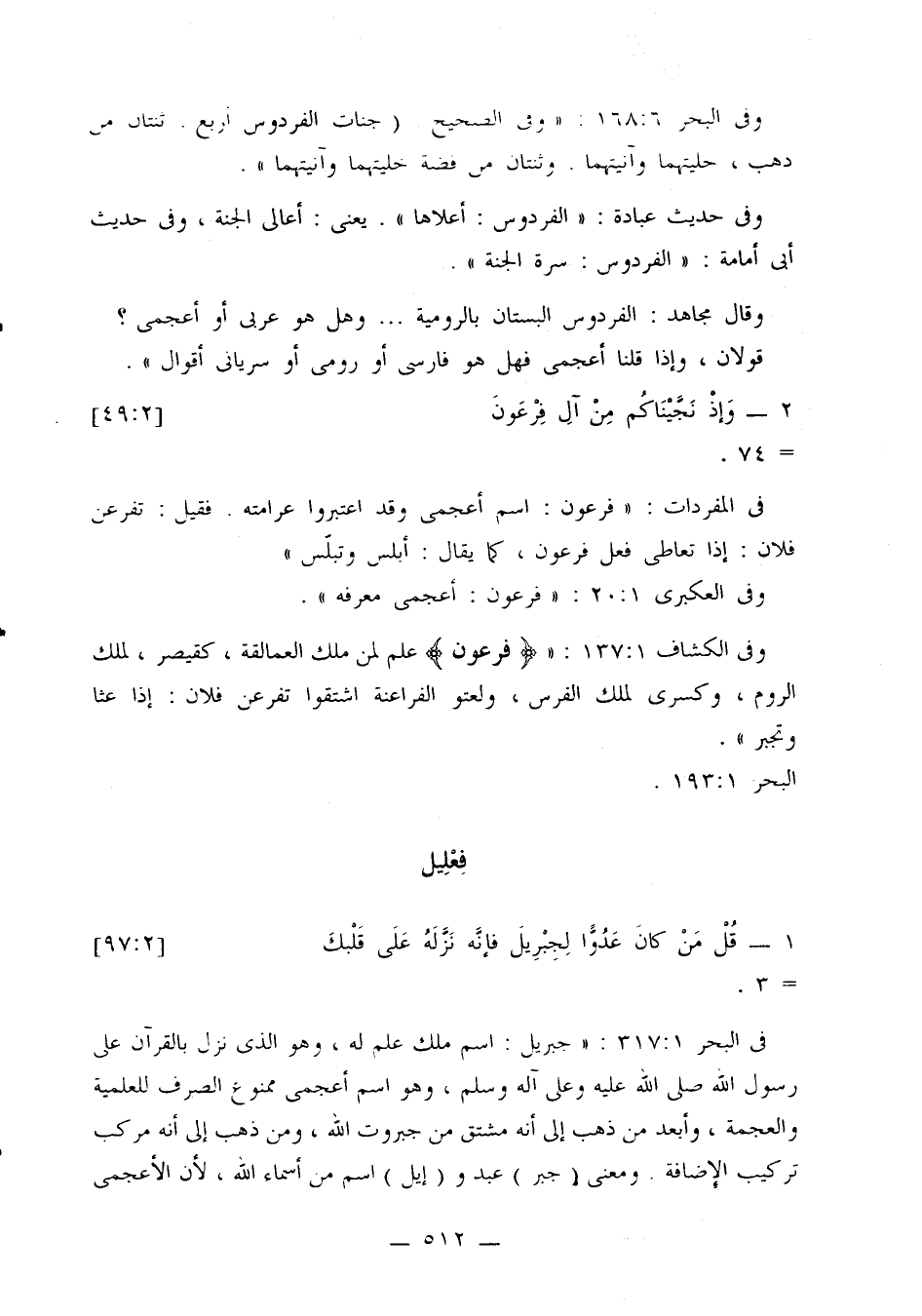 في البحر 1: 317: «جبريل: اسم ملك علم له، وهو الذي نزل بالقرآن على رسول الله صلى الله عليه وعلى آله وسلم، وهو اسم أعجمي ممنوع الصرف للعلمية والعجمة، وأبعد من ذهب إلى أنه مشتق من جبروت الله، ومن ذهب إلى أنه مركب تركيب الإضافة. ومعنى (جبر) عبد و (إيل) اسم من أسماء الله، لأن الأعجمي