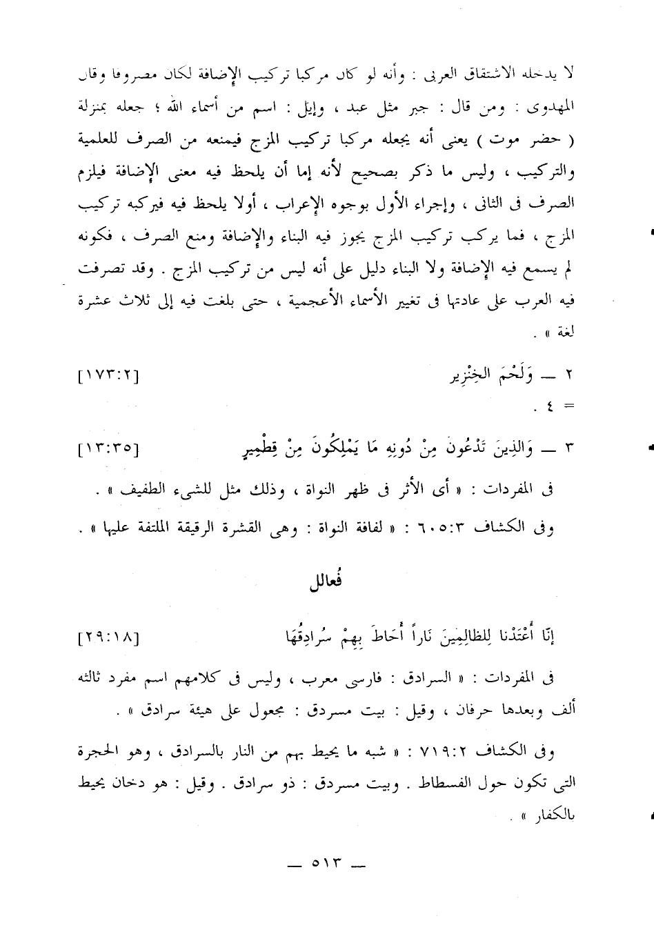 وفي الكشاف 2: 719: «شبه ما يحيط بهم من النار بالسرادق، وهو الحجرة التي تكون حول الفسطاط. وبيت مسردق: ذو سرادق. وقيل: هو دخان يحيط بالكفار».