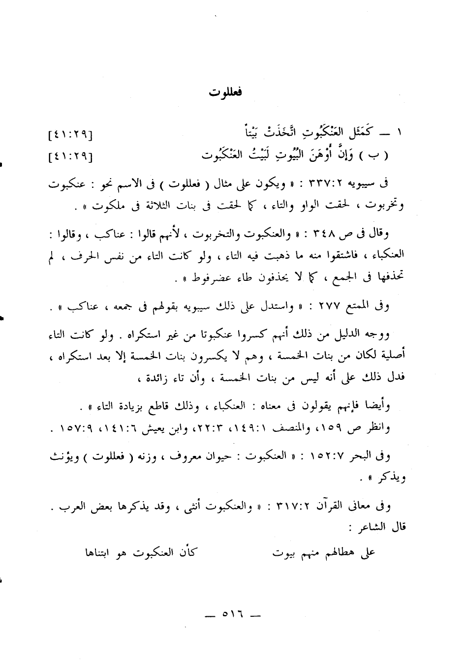 وقال في ص 348: «والعنكبوت والتخربوت، لأنهم قالوا: عناكب، وقالوا: العنكباء، فاشتقوا منه ما ذهبت فيه التاء، ولو كانت التاء من نفس الحرف، لم تحذفها في الجمع، كما لا يحذفون طاء عضرفوط».