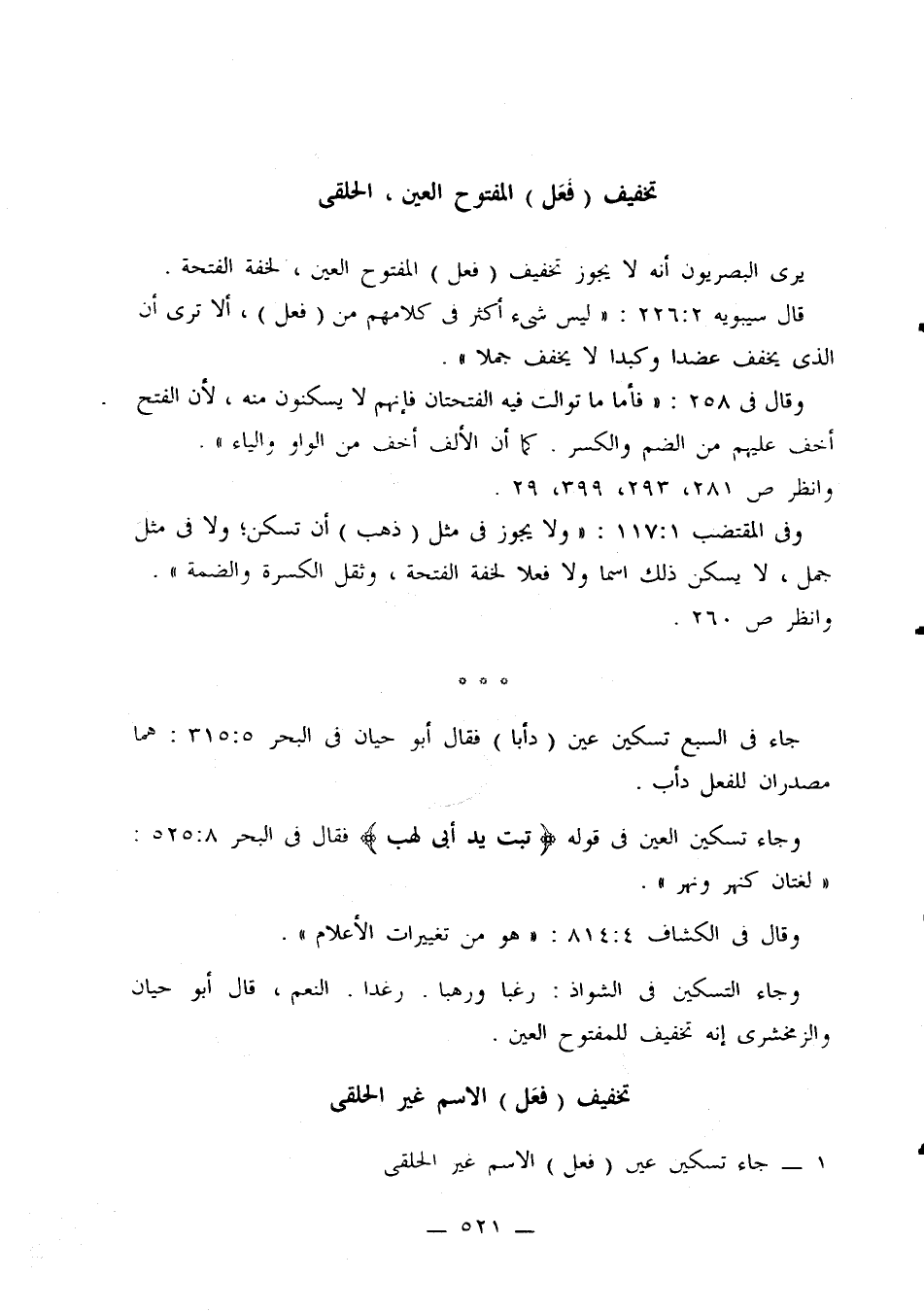 وقال في 258: «فأما ما توالت فيه الفتحتان فإنهم لا يسكنون منه، لأن الفتح أخف عليهم من الضم والكسر. كما أن الألف أخف من الواو والياء».