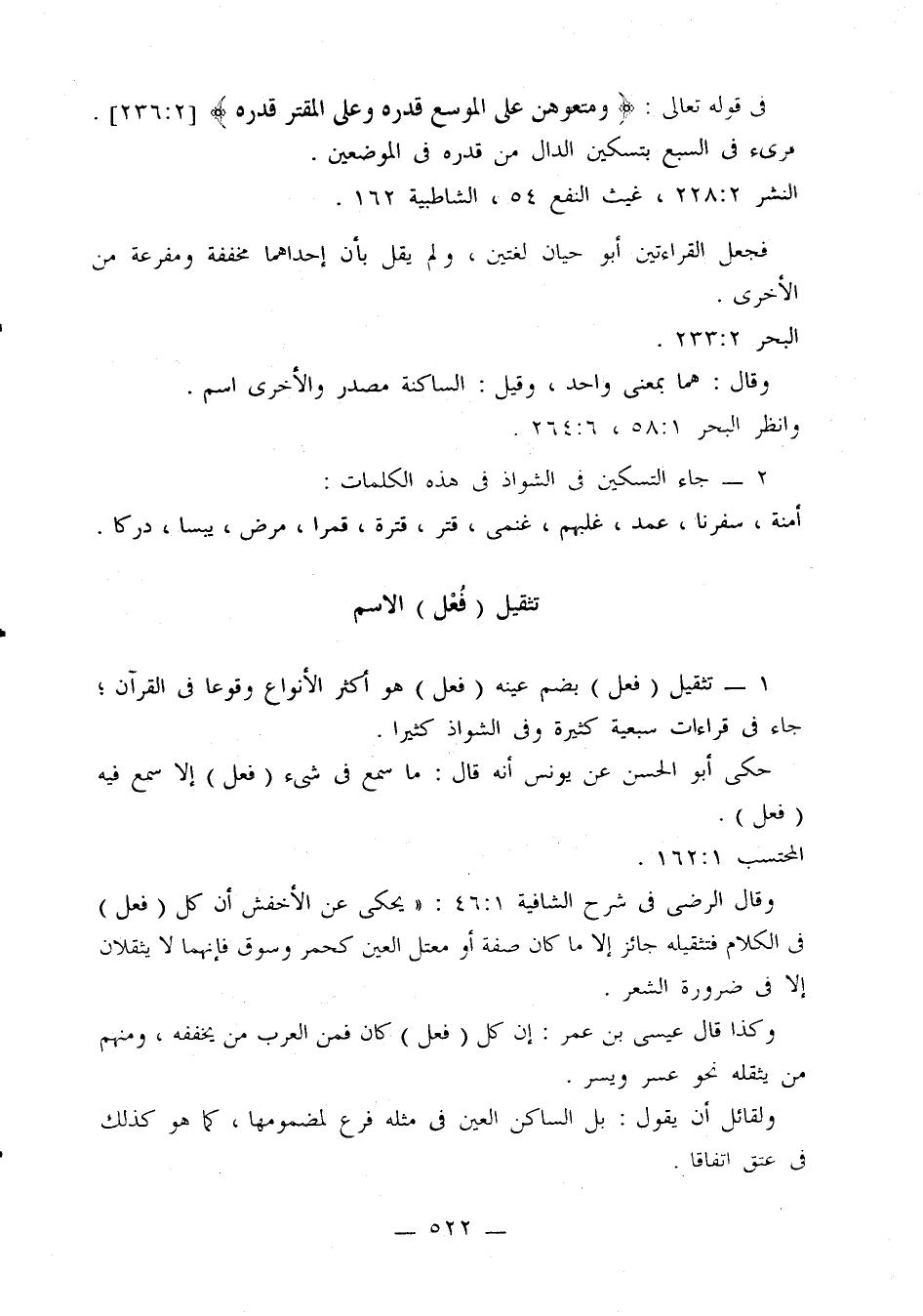 وقال الرضى في شرح الشافية 1: 46: «يحكى عن الأخفش أن كل (فعل) في الكلام فتثقيله جائز إلا ما كان صفة أو معتل العين كحمر وسوق فإنهما لا يثقلان إلا في ضرورة الشعر.