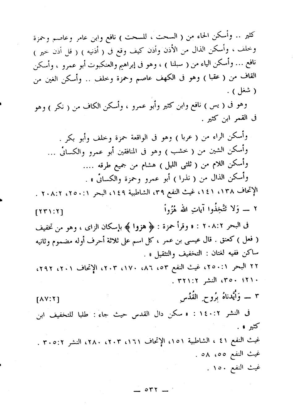 كثير ... وأسكن الحاء من (السحت، للسحت) نافع وابن عامر وعاصم وحمزة وخلف، وأسكن الذال من الأذن وأذن كيف وقع في (أذنيه) (قال أذن خير) نافع ... وأسكن الياء من (سبلنا)، وهو في إبراهيم والعنكبوت أبو عمرو، وأسكن القاف من (عقبا) وهو في الكهف عاصم وحمزة وخلف ... وأسكن الغين من (شغل).