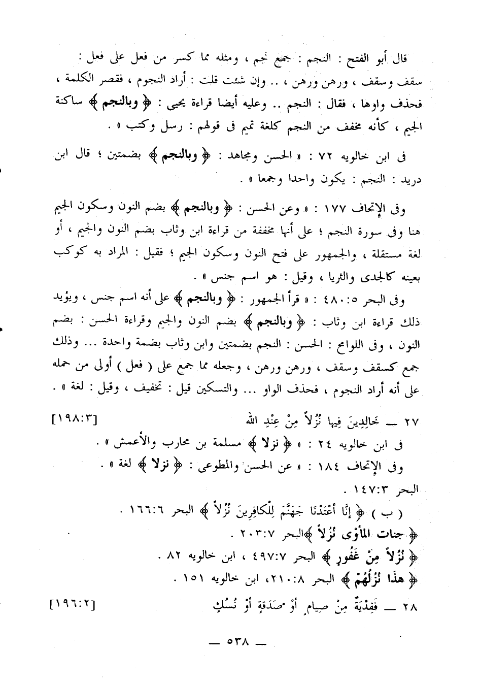 في ابن خالويه 72: «الحسن ومجاهد: {وبالنجم} بضمتين؛ قال ابن دريد: النجم: يكون واحدا وجمعًا».
