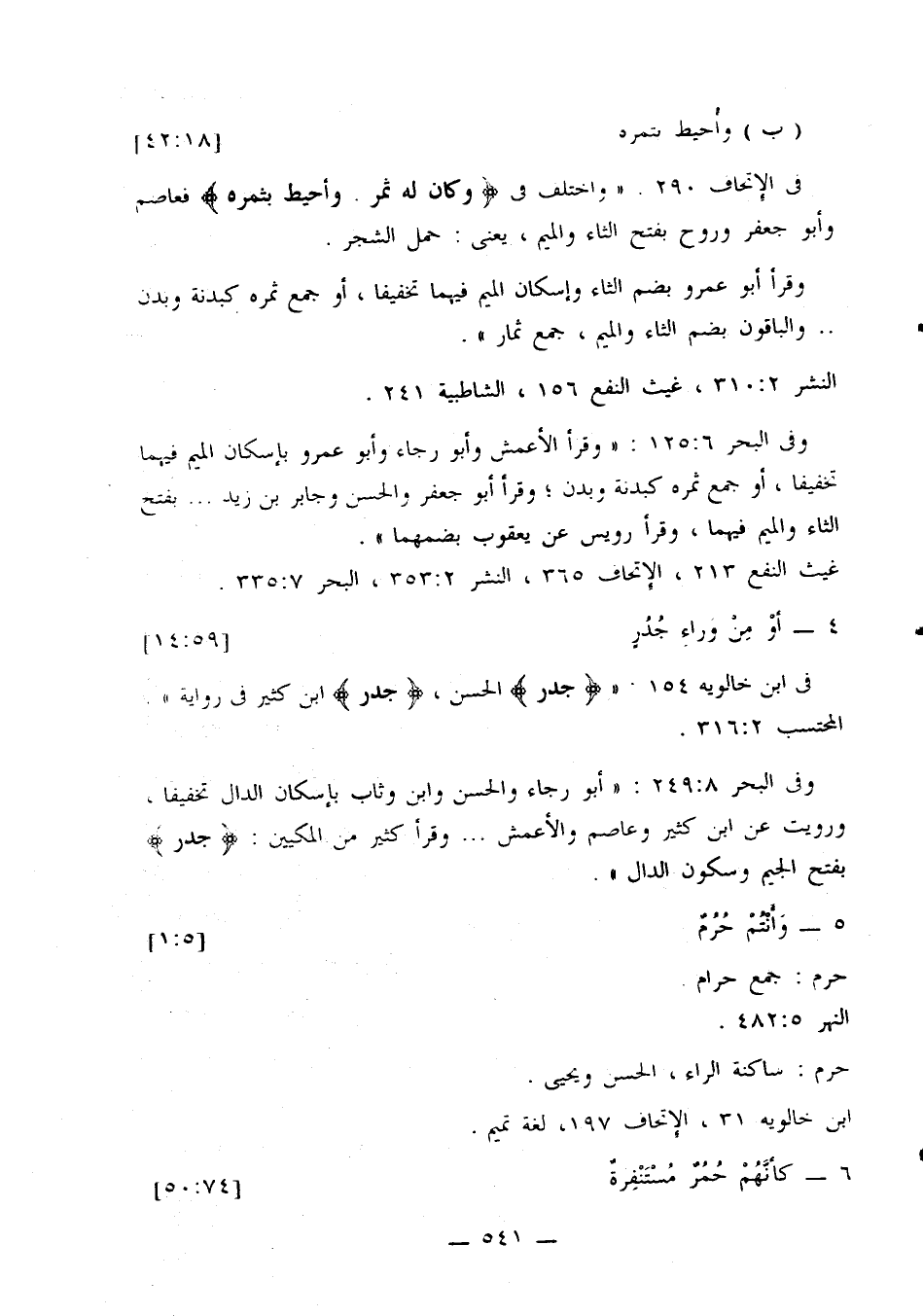 وفي البحر 6: 125: «وقرأ الأعمش وأبو رجاء وأبو عمرو بإسكان الميم فيهما تخفيفا، أو جمع ثمره كبدنة وبدن؛ وقرأ أبو جعفر والحسن وجابر بن زيد ... بفتح الثاء والميم فيهما، وقرأ رويس عن يعقوب بضمهما».