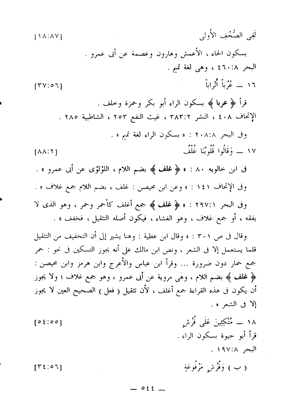 وقال في ص 301: «وقال ابن عطية: وهنا يشير إلى أن التخفيف من التثقيل قلما يستعمل إلا في الشعر، ونص ابن مالك على أنه يجوز التسكين في نحو: حمر جمع حمار دون ضرورة ... وقرأ ابن عباس والأعرج وابن هرمز وابن محيصن: {غلف} بضم اللام، وهي مروية عن أبي عمرو وهو جمع غلاف؛ ولا يجوز أن يكون في هذه القراءة جمع أغلف، لأن تثقيل (فعل) الصحيح العين لا يجوز إلا في الشعر».