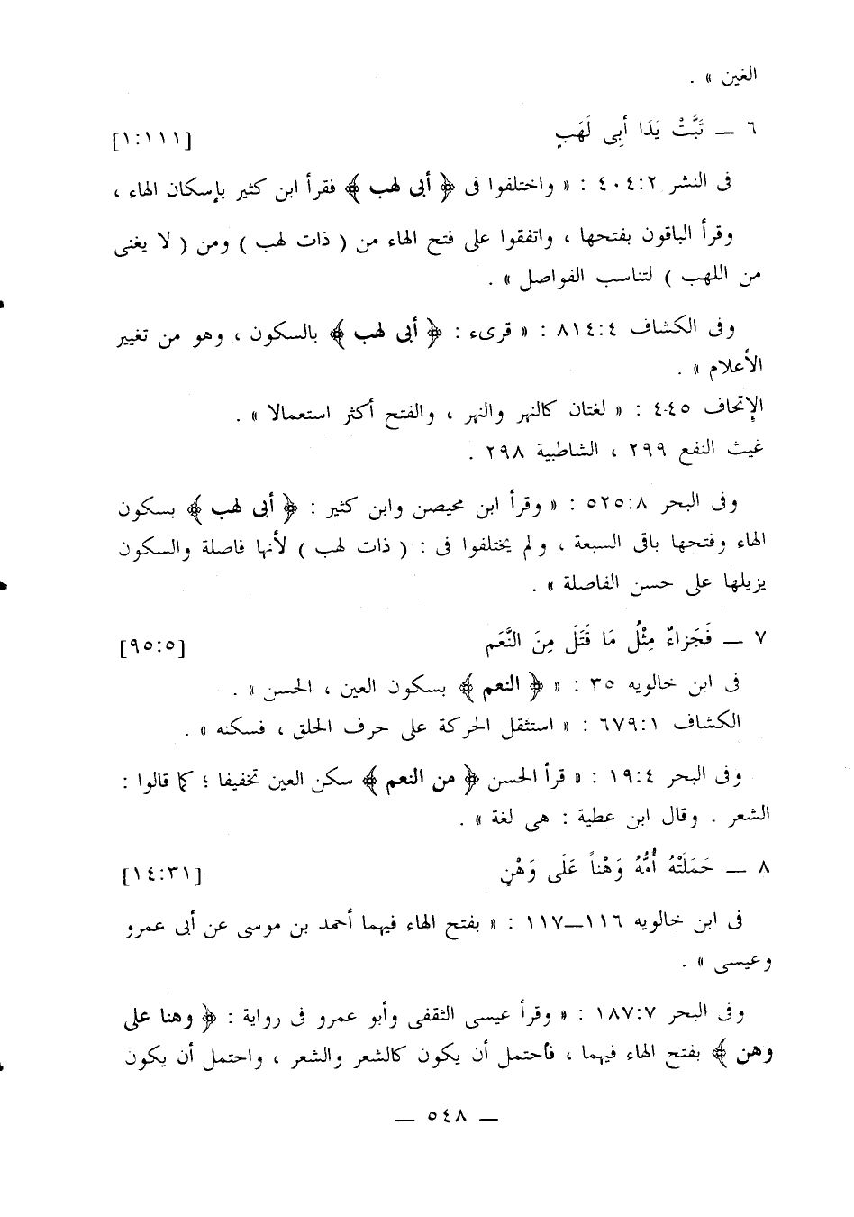 وفي البحر 8: 525: «وقرأ ابن محيصن وابن كثير: {أبي لهب} بسكون الهاء وفتحها باقي السبعة، ولم يختلفوا في: (ذات لهب) لأنها فاصلة والسكون يزيلها على حسن الفاصلة».