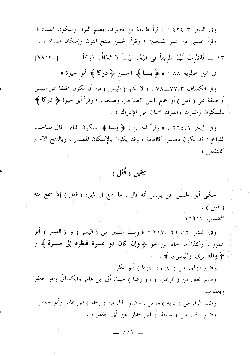 وفي الكشاف 3: 77 - 78: «لا تخلو (اليبس) من أن يكون مخففا عن اليبس أو صفة على (فعل) أو جمع يابس كصاحب وصحب؛ وقرأ أبو حيوة {دركا} بالسكون والدرك والدرك اسمان من الإدراك».