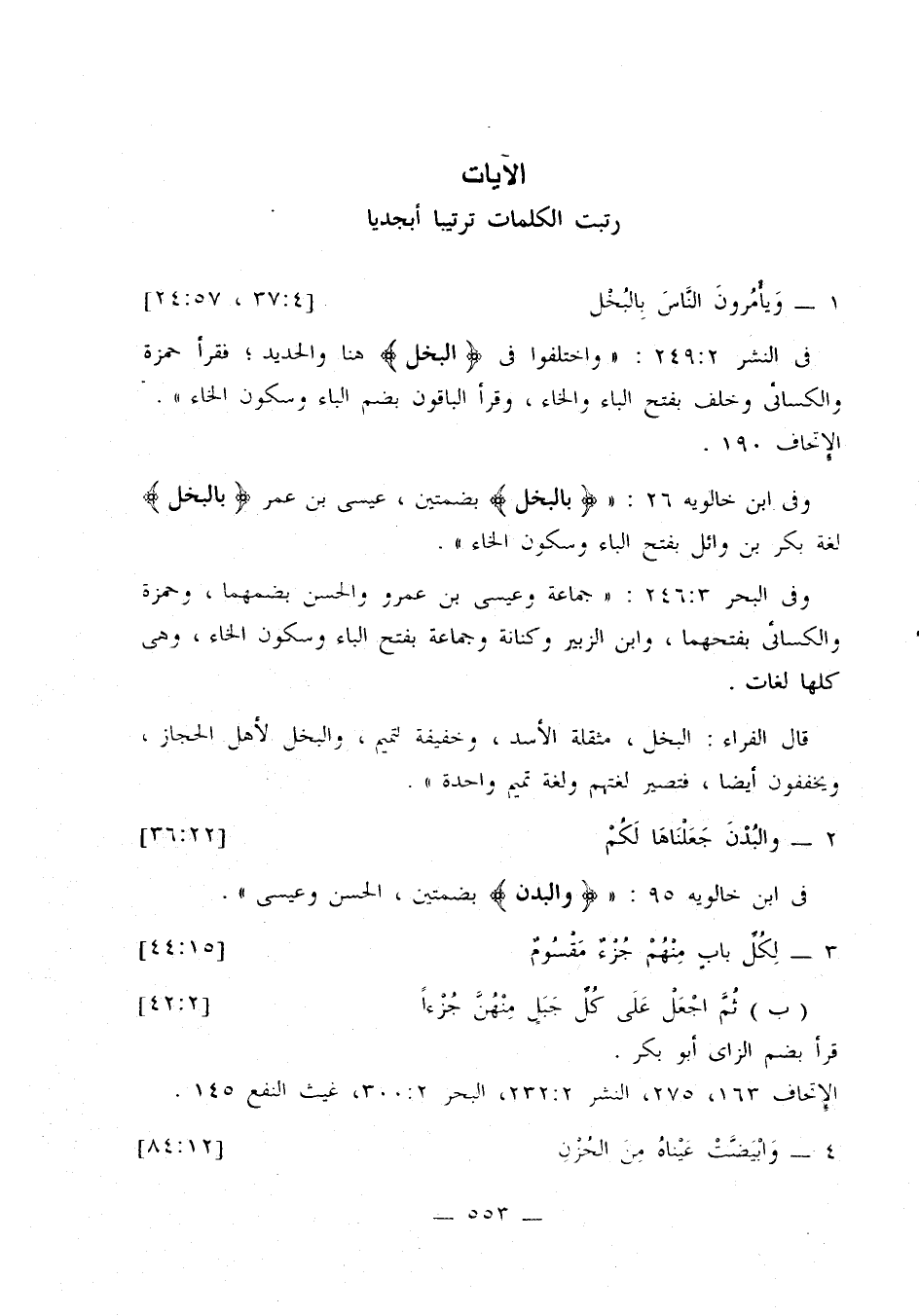 في النشر 2: 249: «واختلفوا في {البخل} هنا والحديد؛ فقرأ حمزة والكسائي وخلف بفتح الباء والخاء، وقرأ الباقون بضم الباء وسكون الخاء». الإتحاف 190.