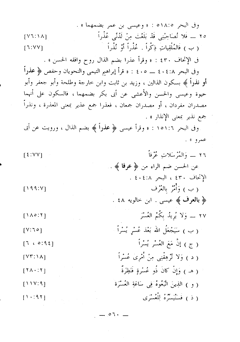 وفي البحر 8: 404 - 405: «قرأ إبراهيم التيمي والنحويان وحفص {عذرا أو نذرا} بسكون الذالين، وزيد بن ثابت وابن خارجة وطلحة وأبو جعفر وأبو حيوة وعيسى والحسن والأعشى عن أبي بكر بضمهما، فالسكون على أنهما مصدران مفردان، أو مصدران جمعان، فعذرا جمع عذير بمعنى المعذرة، ونذرا جمع نذير بمعنى الإنذار».