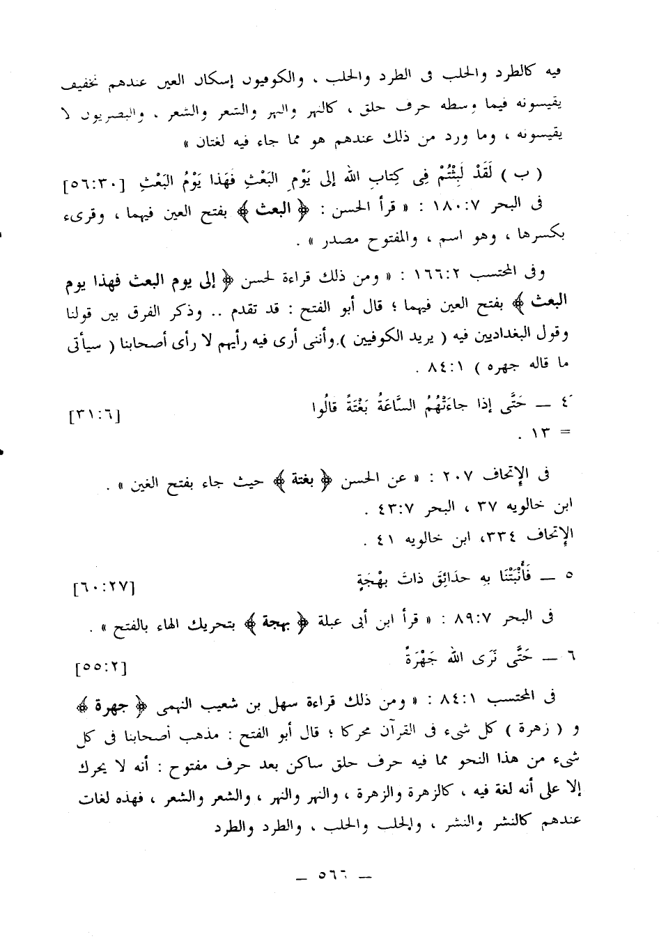 وفي المحتسب 2: 166: «ومن ذلك قراءة لحسن {إلى يوم البعث فهذا يوم البعث} بفتح العين فيهما؛ قال أبو الفتح: قد تقدم ... وذكر الفرق بين قولنا وقول البغداديين فيه (يريد الكوفيين). وأنني أرى فيه رأيهم لا رأي أصحابنا (سيأتي ما قاله جهره) 1: 84».