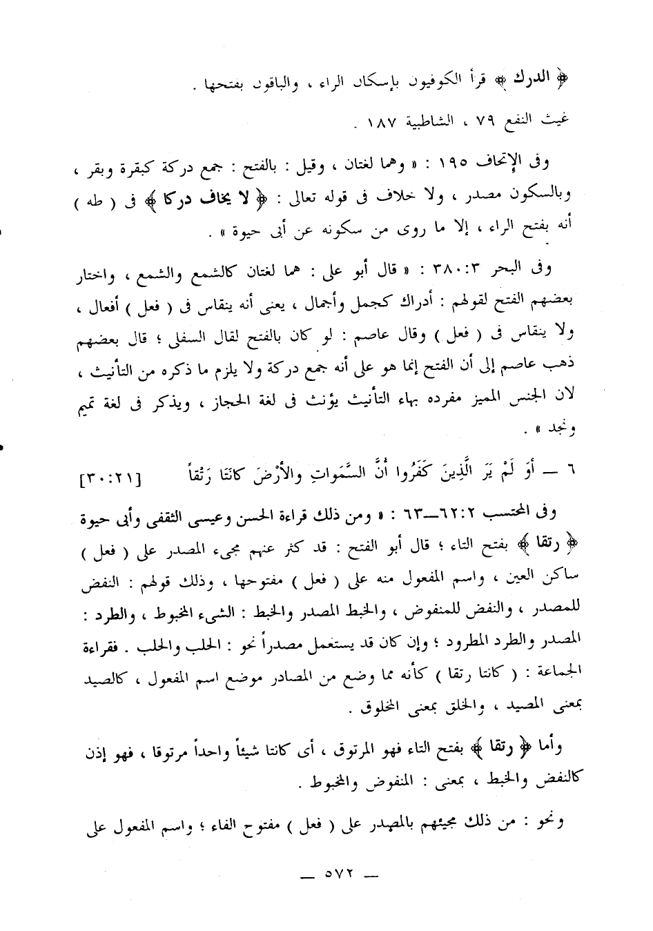 وفي المحتسب 2: 62 - 63: «ومن ذلك قراءة الحسن وعيسى الثقفي وأبي حيوة {رتقا} بفتح التاء؛ قال أبو الفتح: قد كثر عنهم مجيء المصدر على (فعل) ساكن العين، واسم المفعول منه على (فعل) مفتوحها، وذلك قولهم: النفض للمصدر، والنفض للمنفوض، والخبط المصدر والخبط: الشيء المخبوط، والطرد: المصدر والطرد المطرود؛ وإن كان قد يستعمل مصدرًا نحو: الحلب والحلب. فقراءة الجماعة: (كانتا رتقا) كأنه مما وضع من المصادر موضع اسم المفعول، كالصيد بمعنى المصيد، والخلق بمعنى المخلوق.