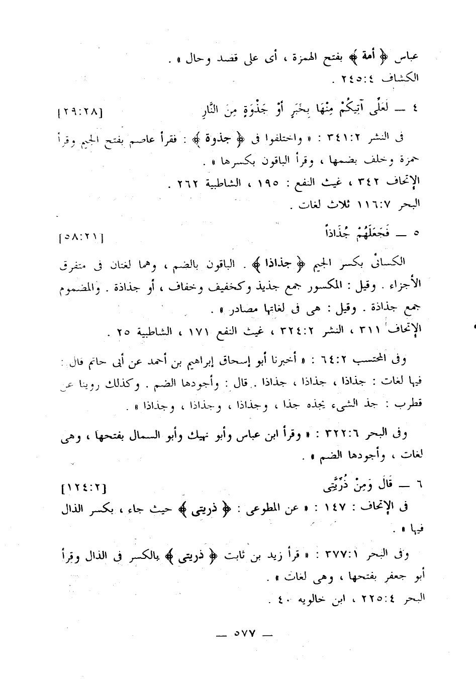 في النشر 2: 341: «واختلفوا في {جذوة}: فقرأ عاصم بفتح الجيم وقرأ حمزة وخلف بضمها، وقرأ الباقون بكسرها». الإتحاف 342، غيث النفع: 195، الشاطبية 262.