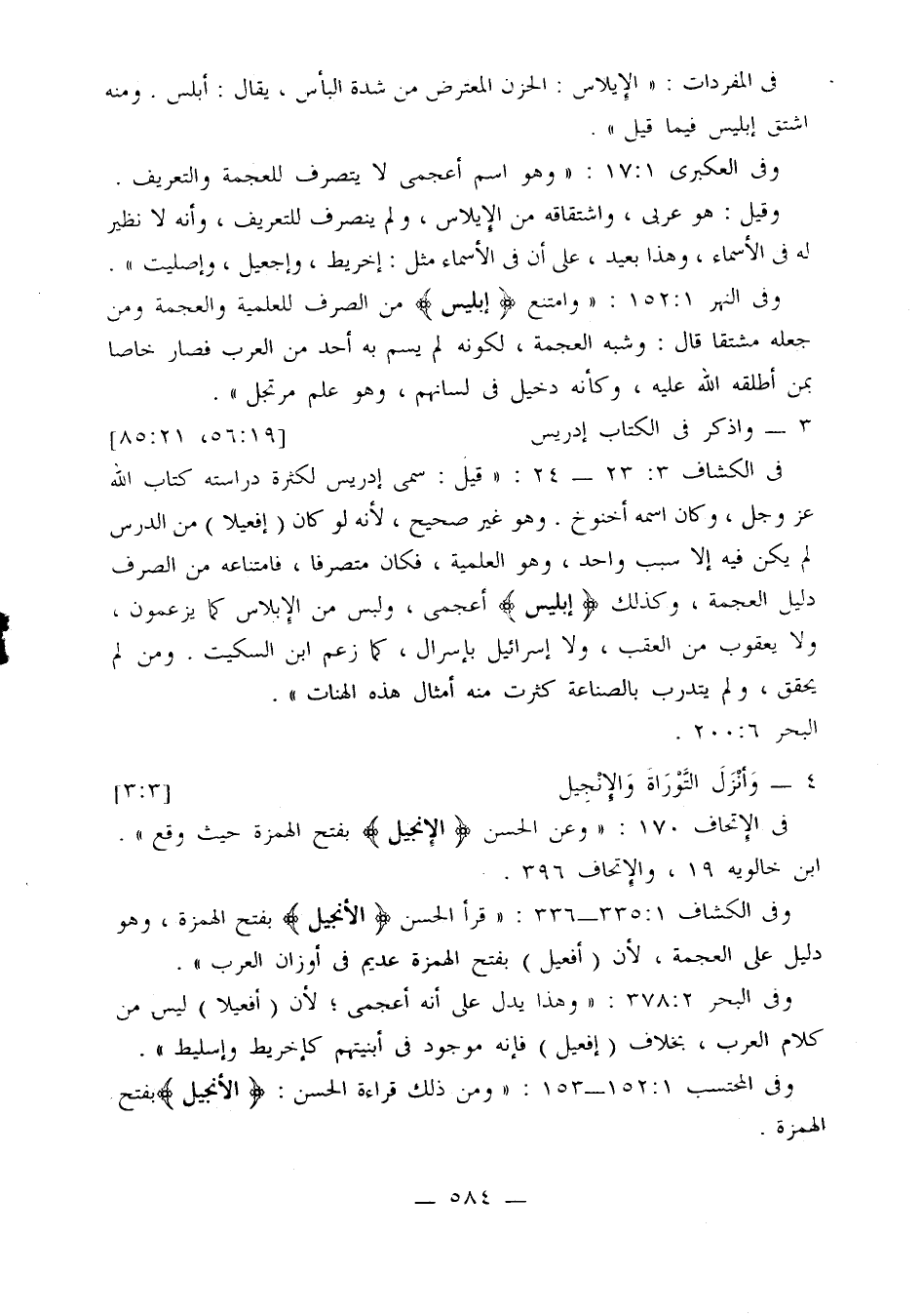 وفي النهر 1: 152: «وامتنع {إبليس} من الصرف للعلمية والعجمة ومن جعله مشتقا قال: وشبه العجمة، لكونه لم يسم به أحد من العرب فصار خاصا بمن أطلقه الله عليه، وكأنه دخيل في لسانهم، وهو علم مرتجل».