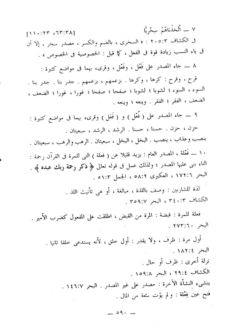 10 - فَعْلة، المصدر العام: يزيد قليلا عن (فعلة) التي للمرة في القرآن رحمة: التاء بني عليها المصدر؛ ولذلك عمل في قوله تعالى {ذكر رحمة ربك عبده}. البحر 6: 172، العكبري 2: 58، الجمل 3: 51.