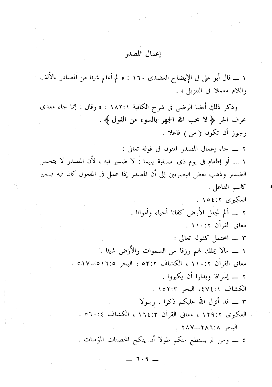 1 - قال أبو علي في الإيضاح العضدي 160: «لم أعلم شيئًا من المصادر بالألف واللام معملا في التنزيل».