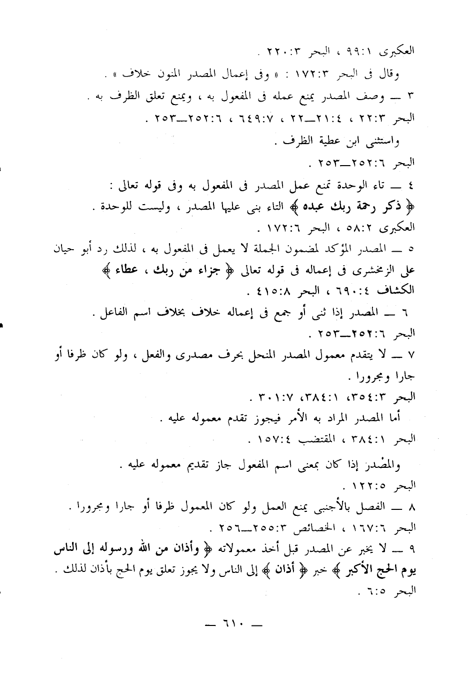 9 - لا يخبر عن المصدر قبل أخذ معمولاته {وأذان من الله ورسوله إلى الناس يوم الحج الأكبر} خبر {أذان} إلى الناس ولا يجوز تعلق يوم الحج بأذان لذلك. البحر 5: 6.