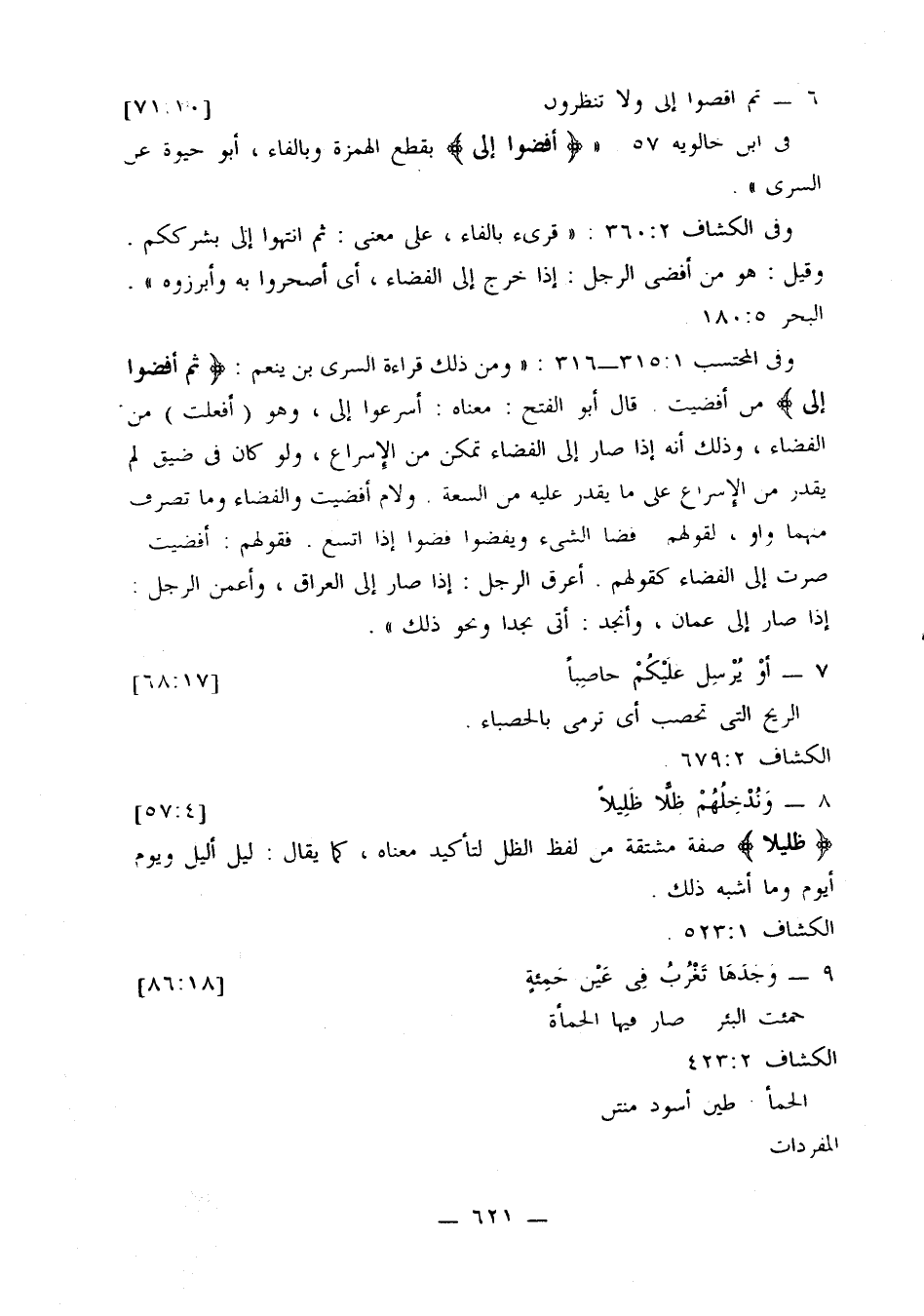 وفي المحتسب 1: 315 - 316: «ومن ذلك قراءة السري بن ينعم: {ثم أفضوا إلي} من أفضيت. قال أبو الفتح: معناه: أسرعوا إلي، وهو (أفعلت) من الفضاء، وذلك أنه إذا صار إلى الفضاء تمكن من الإسراع، ولو كان في ضيق لم يقدر من الإسراع على ما يقدر عليه من السعة. ولام أفضيت والفضاء وما تصرف منهما واو، لقولهم فضا الشيء ويفضوا فضوا إذا اتسع. فقولهم: أفضيت صرت إلى الفضاء كقولهم. أعرق الرجل: إذا صار إلى العراق، وأعمن الرجل: إذا صار إلى عمان، وأنجد: أتى بجدا ونحو ذلك».