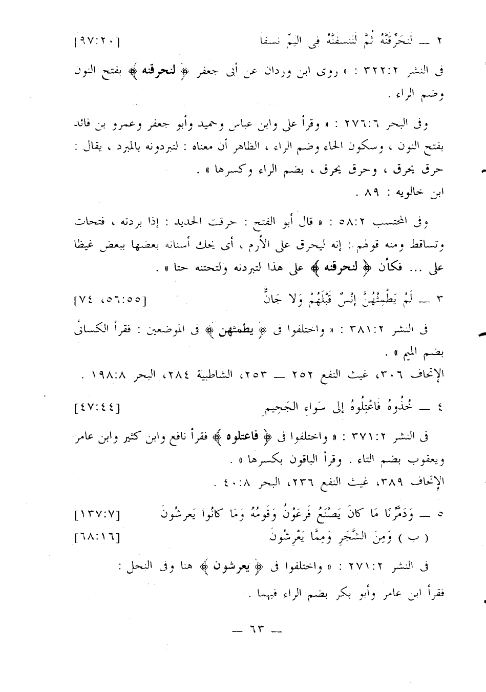 في النشر 2: 322: «روى ابن وردان عن أبي جعفر {لنحرقنه} بفتح النون وضم الراء».