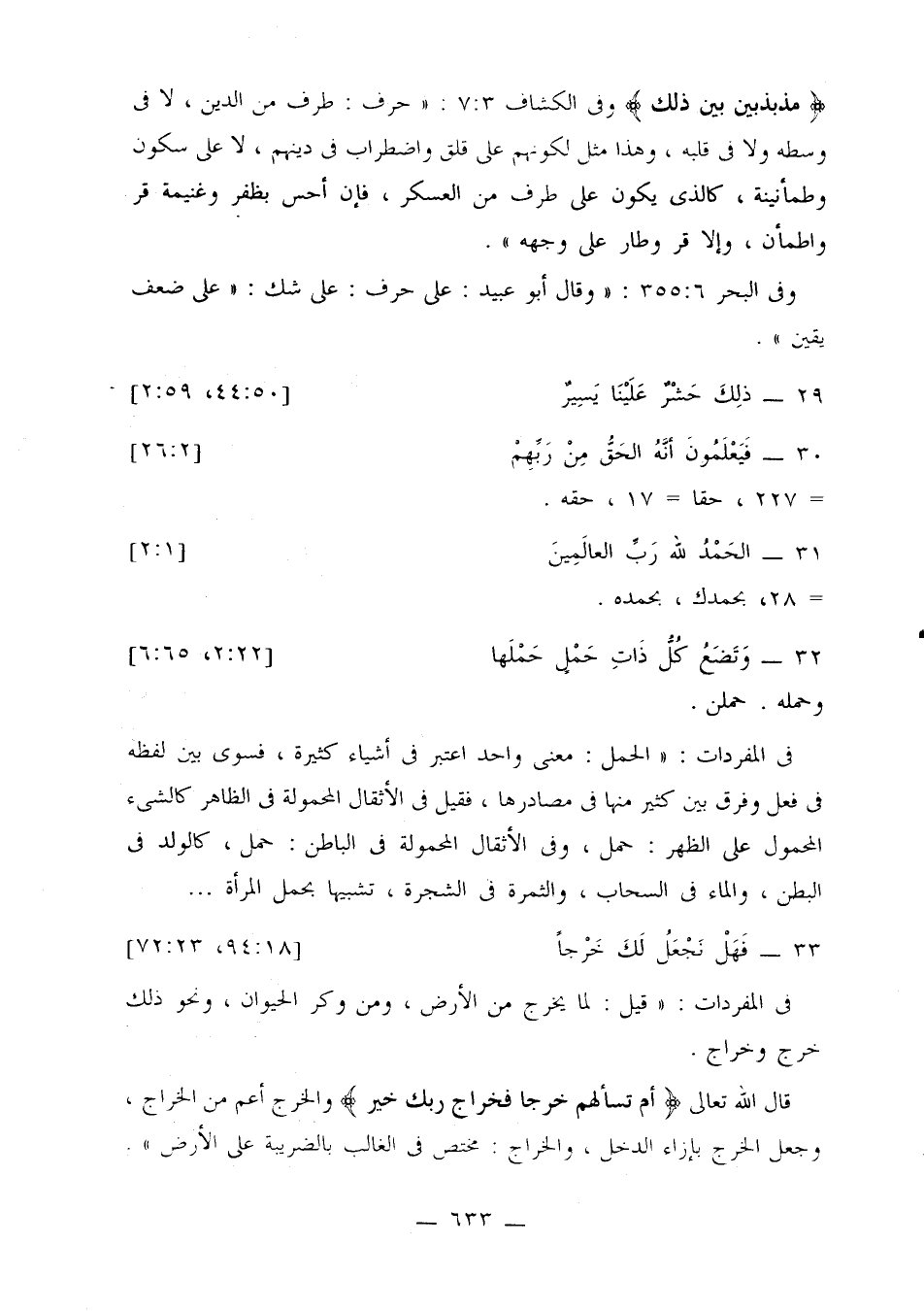 مذبذبين بين ذلك وفي الكشاف 3: 7: حرف: طرف من الدين، لا في وسطه ولا في قلبه، وهذا مثل لكونهم على قلق واضطراب في دينهم، لا على سكون وطمأنينة، كالذي يكون على طرف من العسكر، فإن أحس بظفر وغنيمة قر واطمأن، وإلا قر وطار على وجهه».