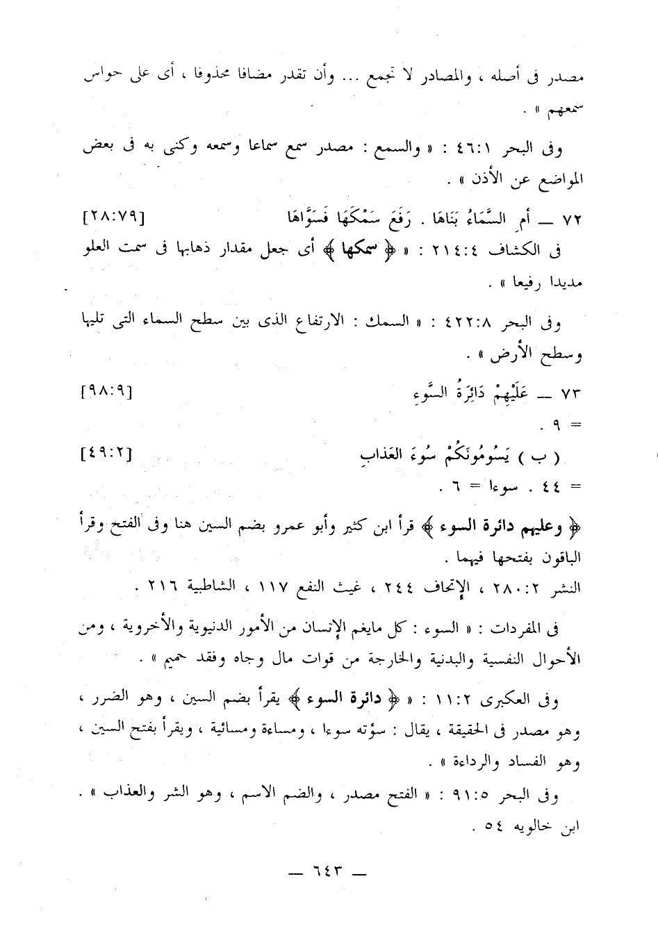 وفي العكبري 2: 11: «{دائرة السوء} يقرأ بضم السين، وهو الضرر، وهو مصدر في الحقيقة، يقال: سؤته سوءا، ومساءة ومسائية، ويقرأ بفتح السين، وهو الفساد والرداءة».