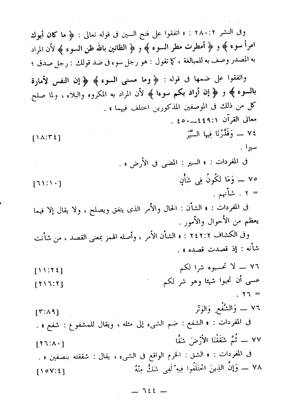 واتفقوا على ضمها في قوله: {وما مسني السوء} {إن النفس لأمارة بالسوء} و {إن أراد بكم سوءا} لأن المراد به المكروه والبلاء، ولما صلح كل من ذلك في الموصفين المذكورين اختلف فيهما».